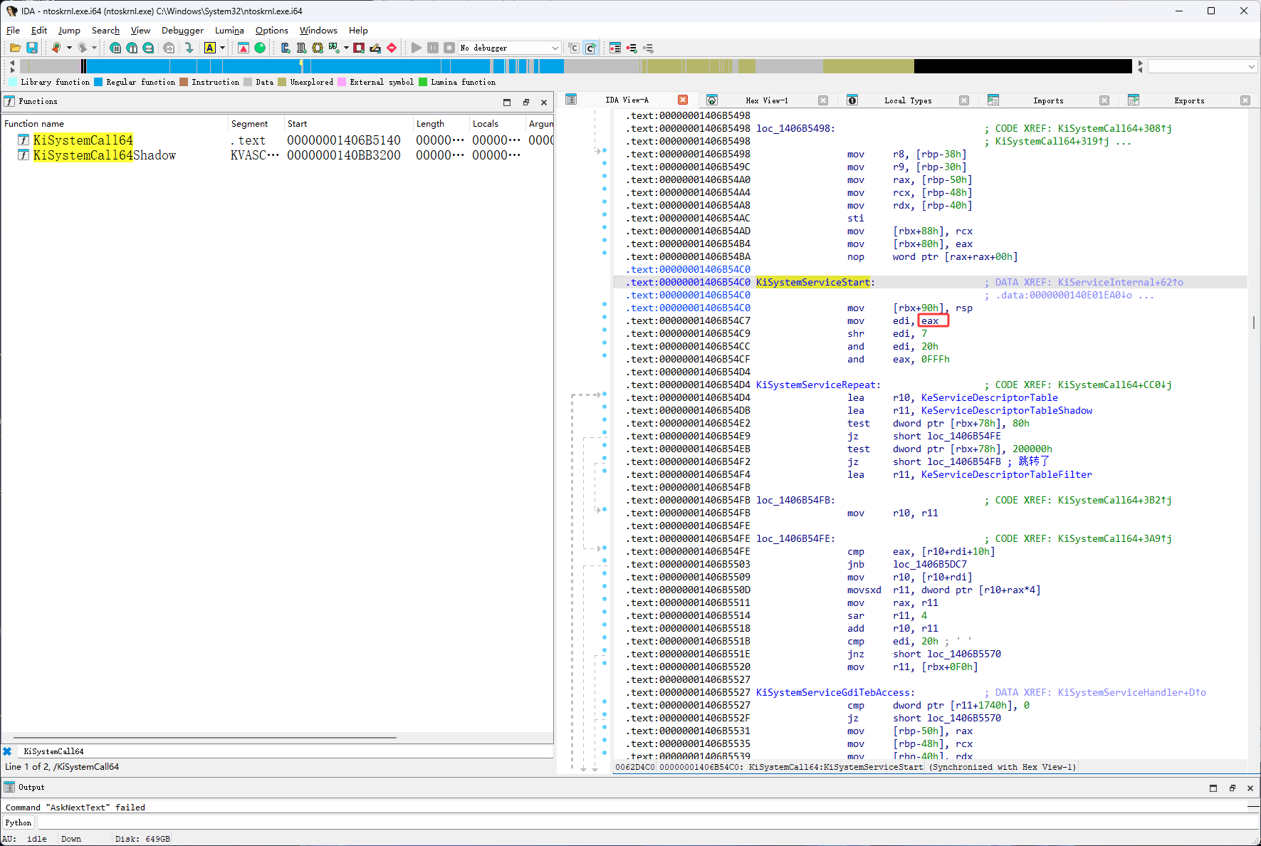 然后先介绍一下情况,下图红框的eax就是我们从3环传的索引,比如之前的ReadProcessMemory传的是3F,OpenProcess传的是0x26,这里的代码会通过eax进行一些列的操作最终得到0环中函数的地址,下面就一步一步调试代码,看看它是怎样得到的函数地址,又是怎样调用的