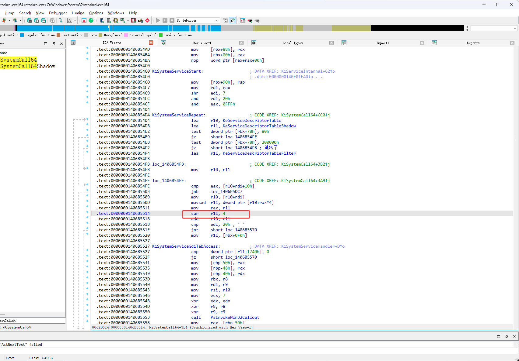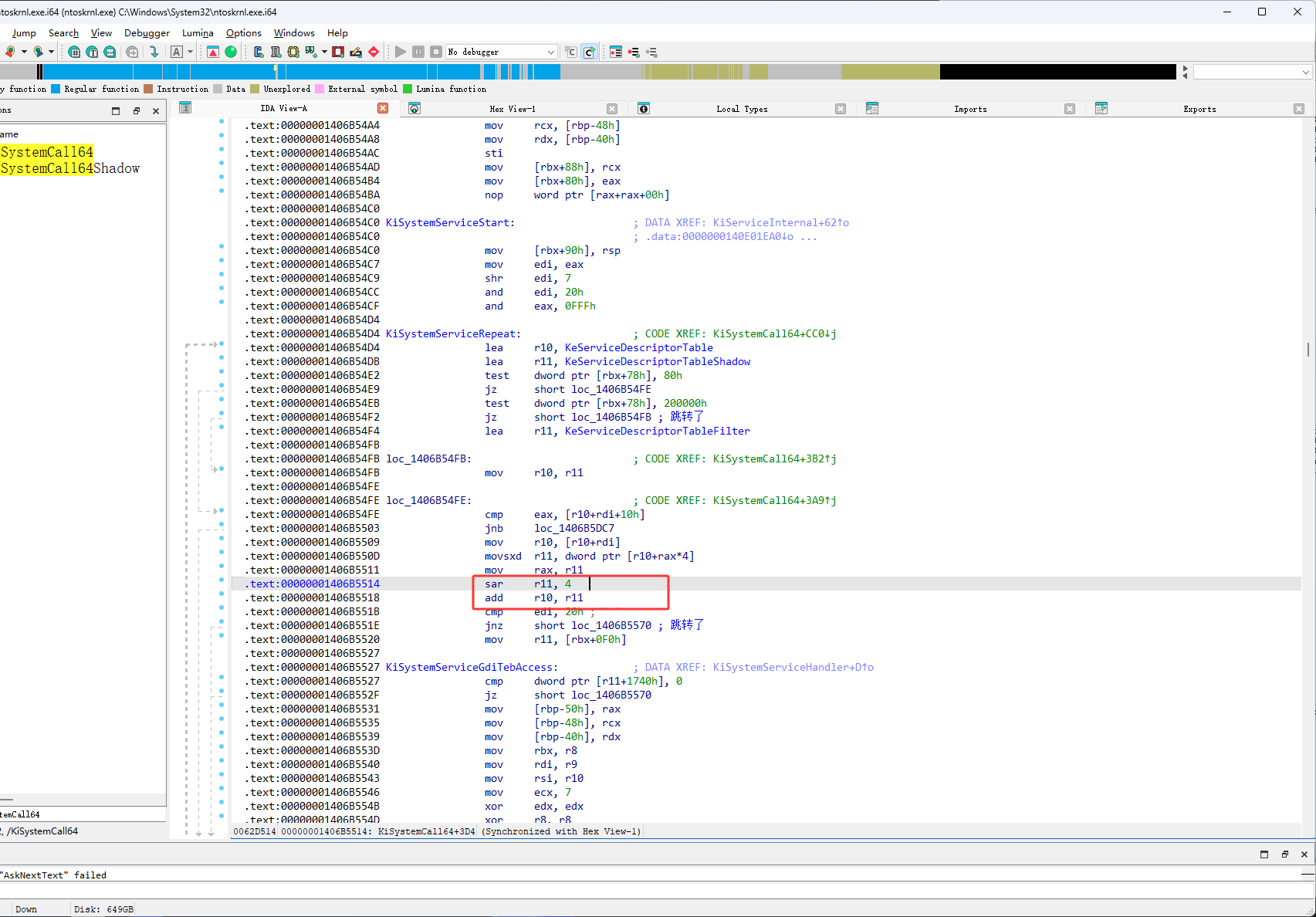 然后继续按F11,r10是ssdt,这里与r11进行了相加,这说明r11是一个偏移,r10+r11是一个内存地址