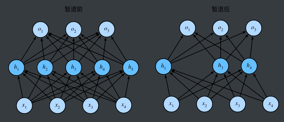 这个想法被称为暂退法(dropout)。 暂退法在前向传播过程中,计算每一内部层的同时注入噪声,这已经成为训练神经网络的常用技术。 这种方法之所以被称为暂退法,因为我们从表面上看是在训练过程中丢弃(drop out)一些神经元。 在整个训练过程的每一次迭代中,标准暂退法包括在计算下一层之前将当前层中的一些节点置零。
