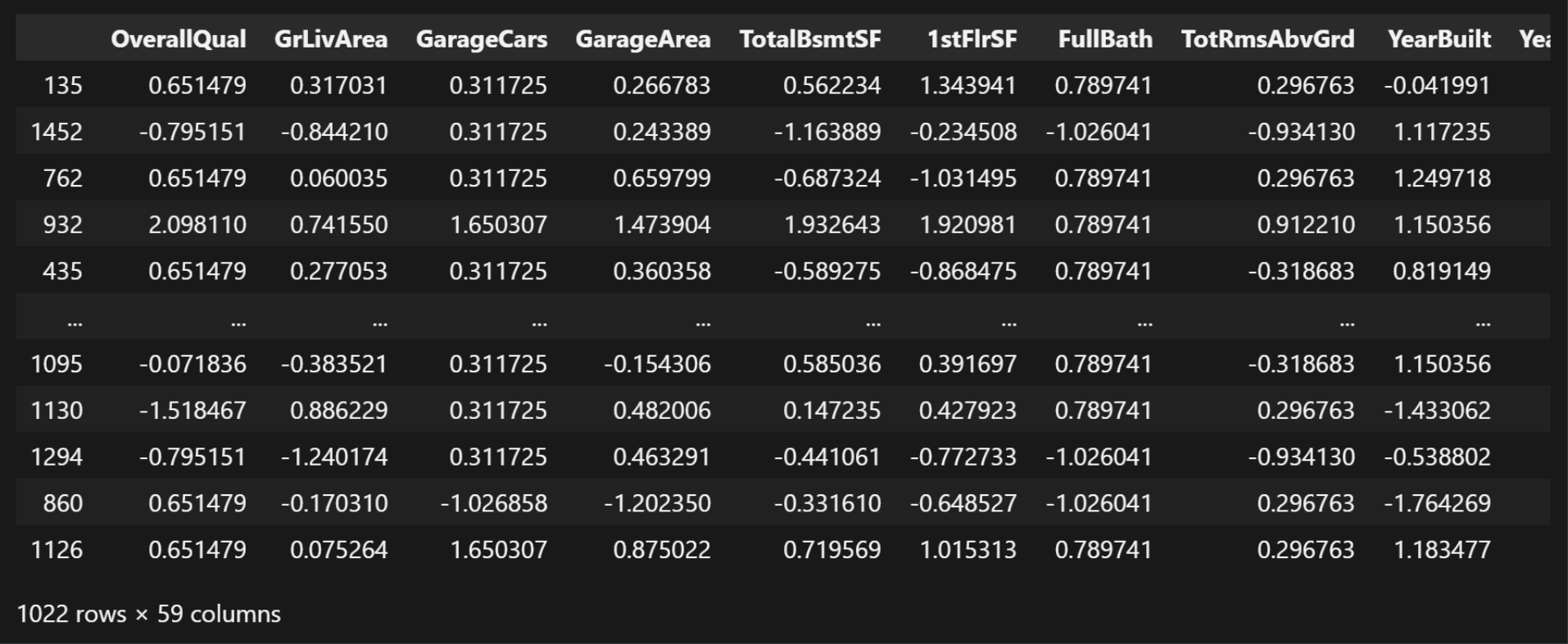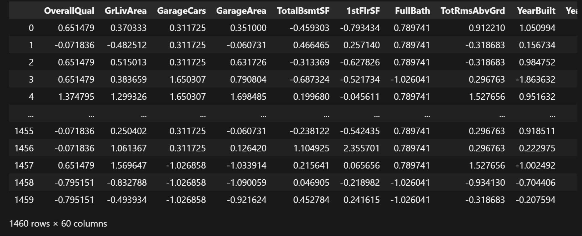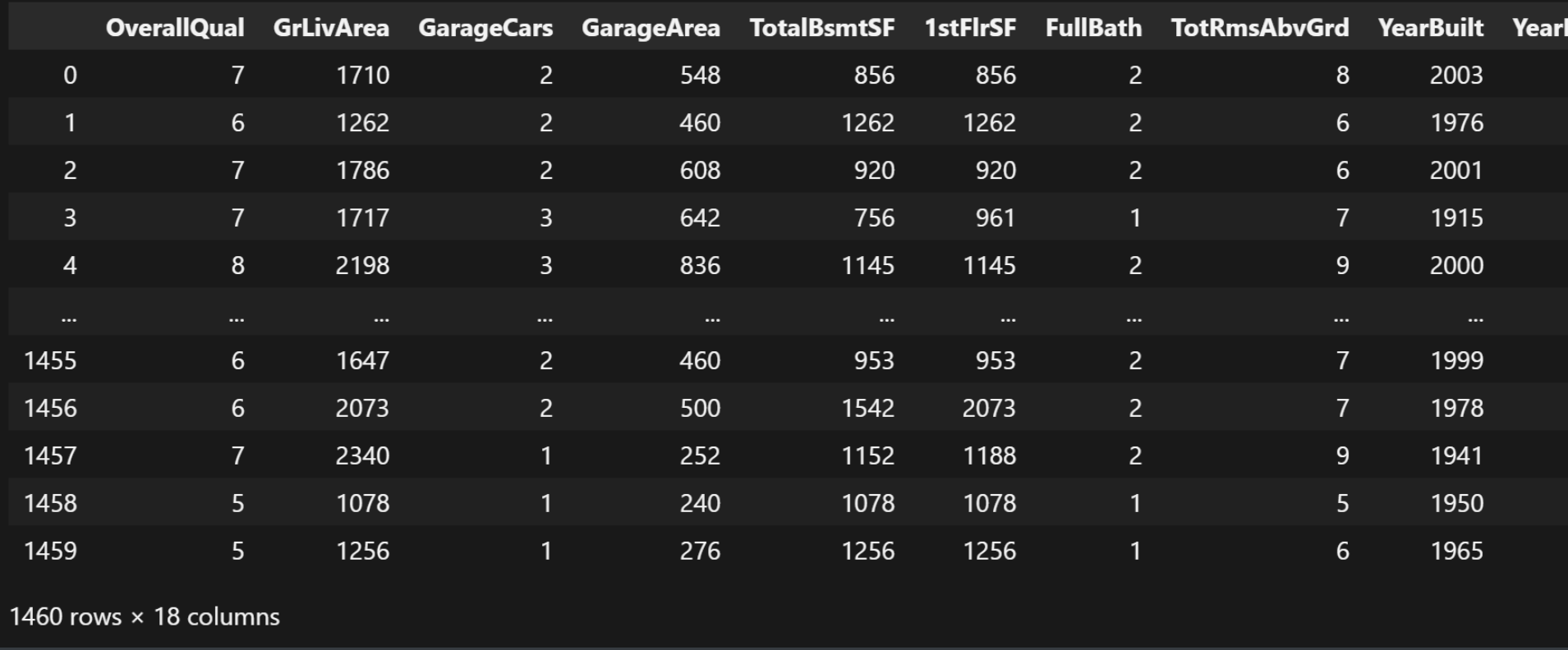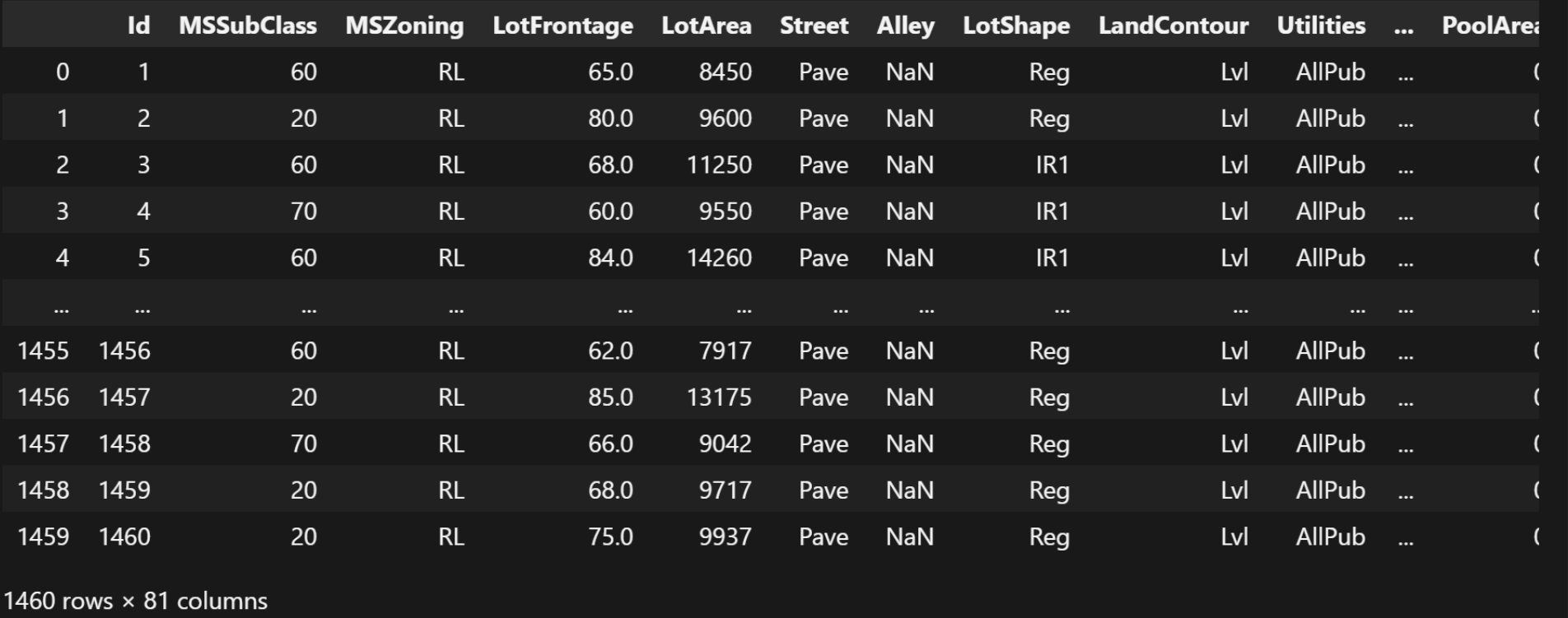 | | Id | MSSubClass | LotFrontage | LotArea | OverallQual | OverallCond | YearBuilt | YearRemodAdd | MasVnrArea | BsmtFinSF1 | ... | WoodDeckSF | OpenPorchSF | EnclosedPorch | 3SsnPorch | ScreenPorch | PoolArea | MiscVal | MoSold | YrSold | SalePrice |