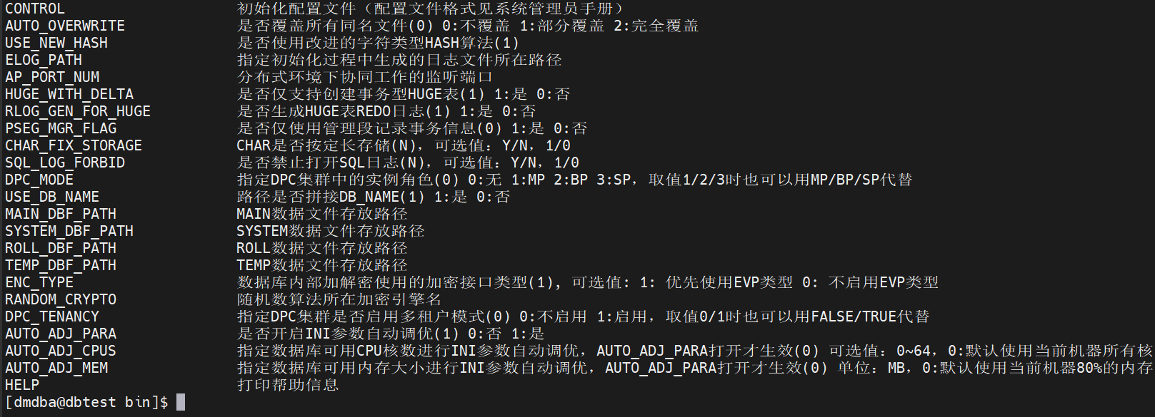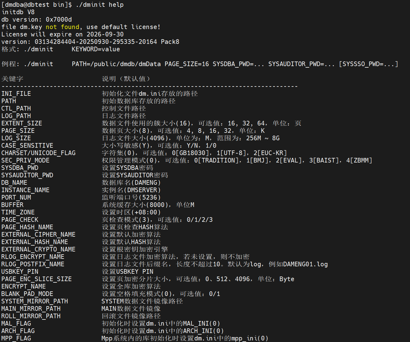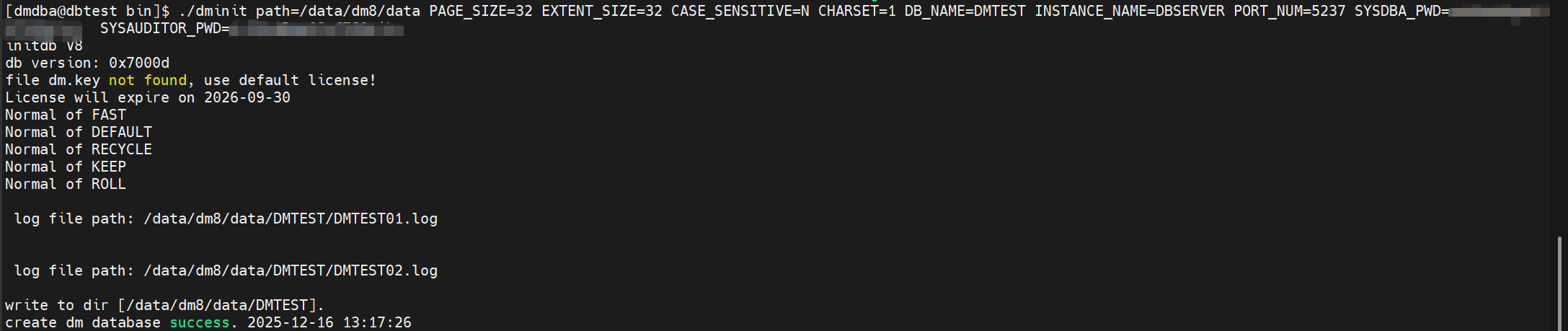 ./dminit path=/data/dm8/data PAGE_SIZE=32 EXTENT_SIZE=32 CASE_SENSITIVE=N CHARSET=1 DB_NAME=DMTEST INSTANCE_NAME=DBSERVER PORT_NUM=5237 SYSDBA_PWD=********* SYSAUDITOR_PWD=**********