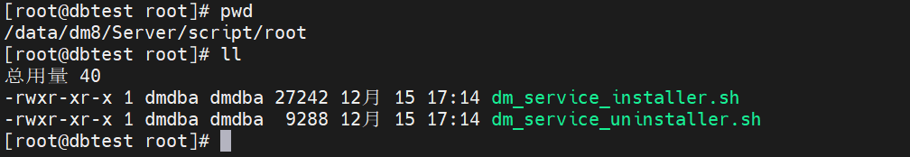 注册服务脚本为 dm_service_installer.sh,用户可以使用注册服务脚本将服务脚本注册成为操作系统服务。注册服务需使用 root 用户进行注册,使用 root 用户进入数据库安装目录的 /script/root 下,如下所示: