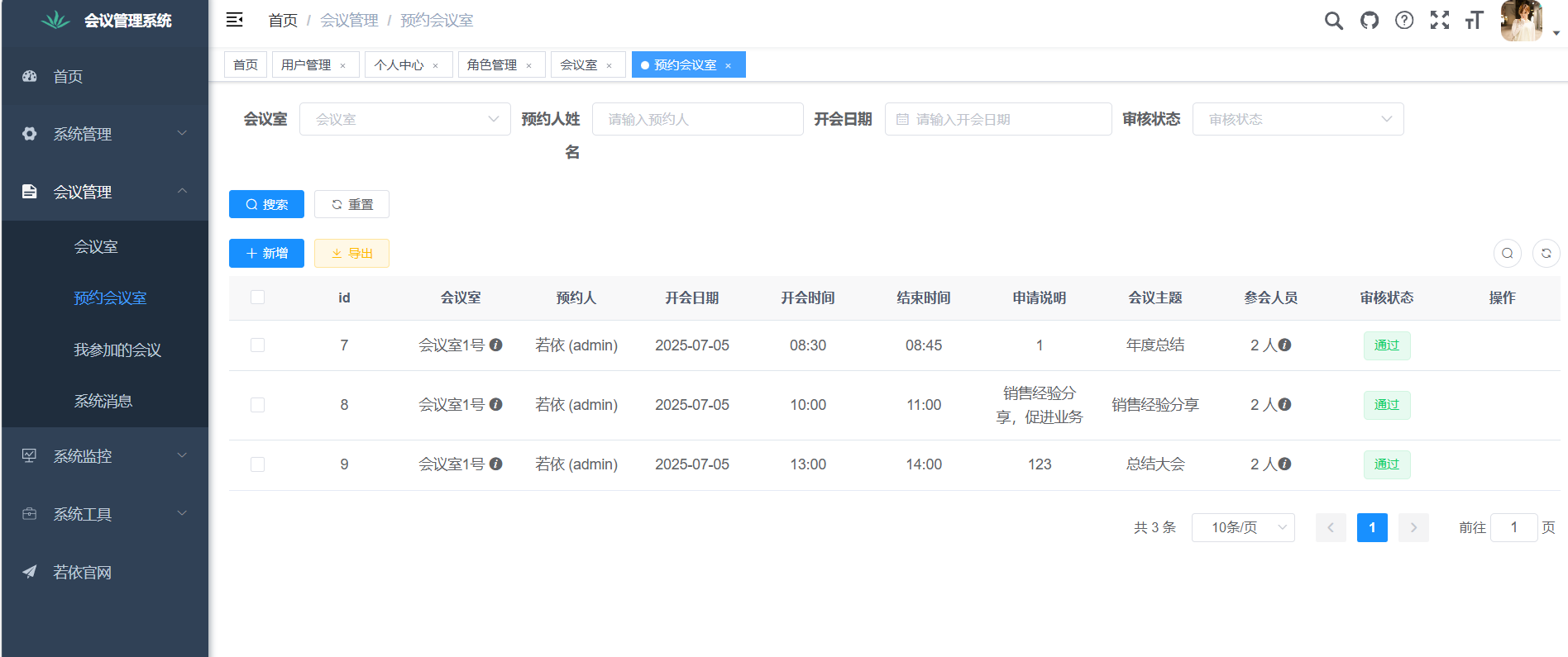 - 预约审核:对普通用户提交的会议室预约申请进行审批,包括批准或驳回,并更新预约状态。