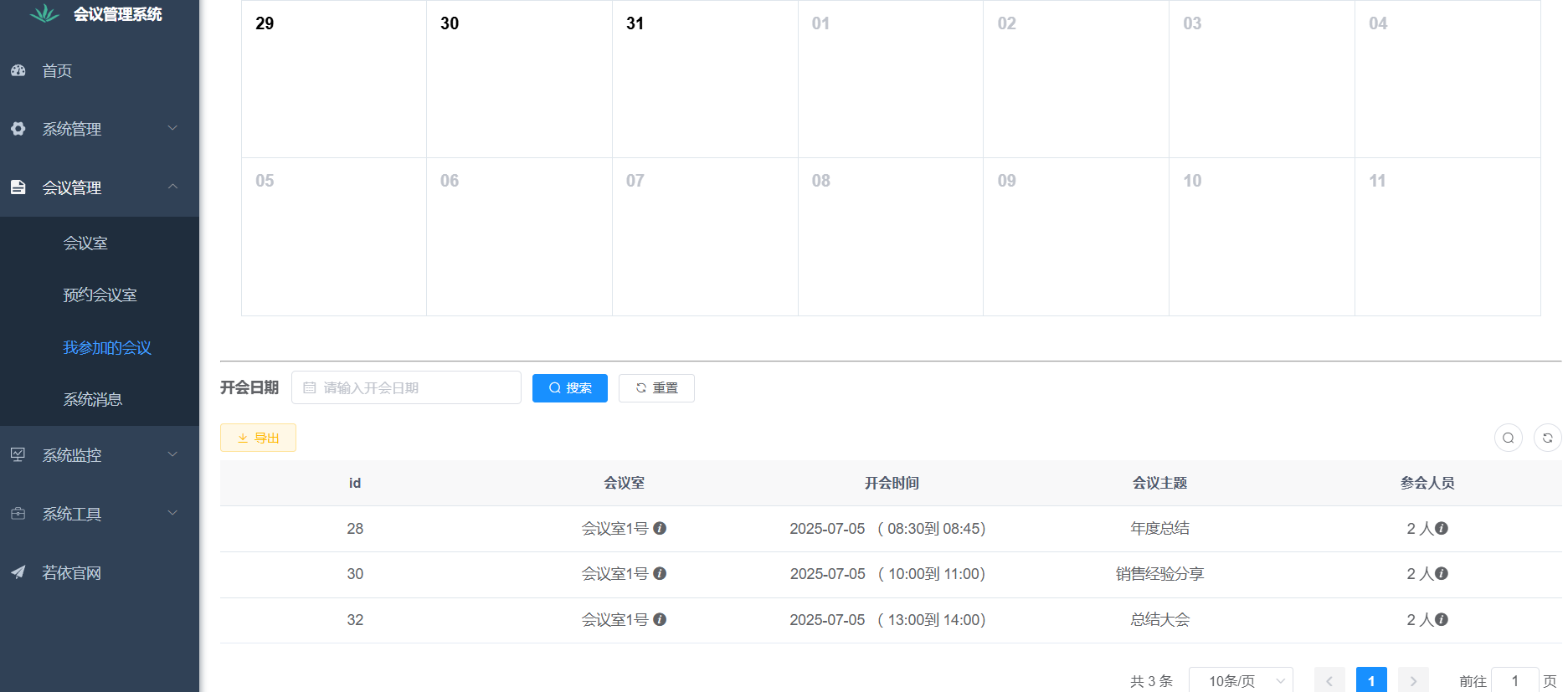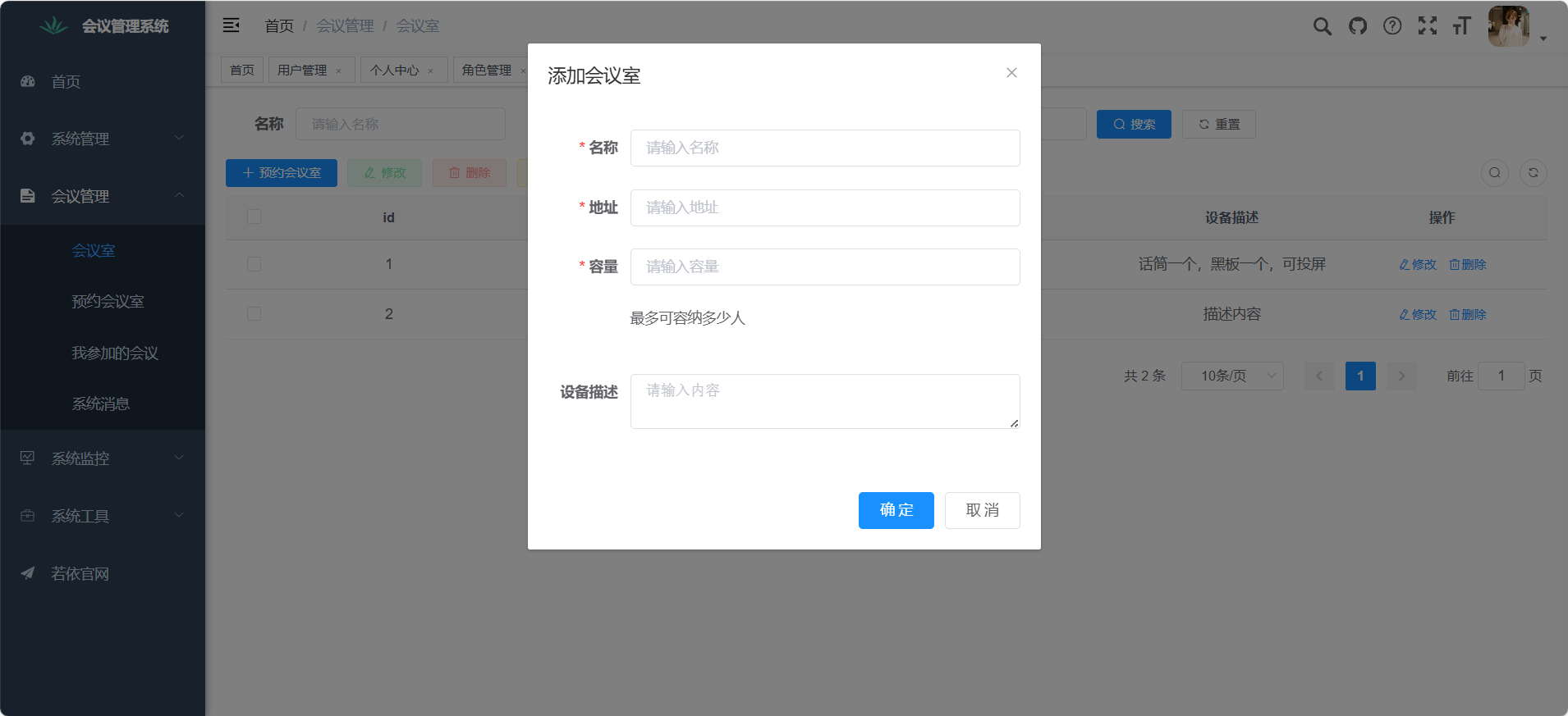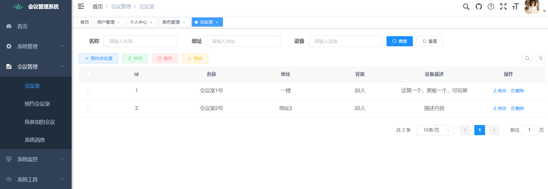 - 会议室管理:对系统中的会议室资源进行增、删、改、查操作,维护会议室的名称、地址、容量及设备描述等详细信息。