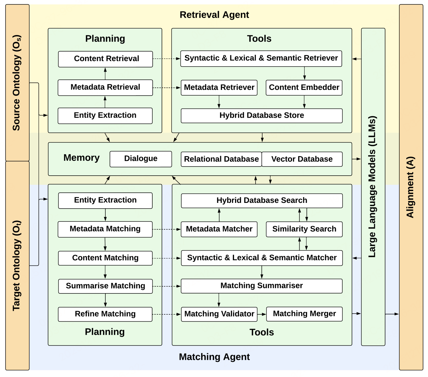 核心逻辑:将"检索→匹配"流程,拆分为两个共享内存的代理(Retrieval Agent + Matching Agent),配合规划模块、OM工具集和混合数据库,实现高效、低幻觉的匹配。