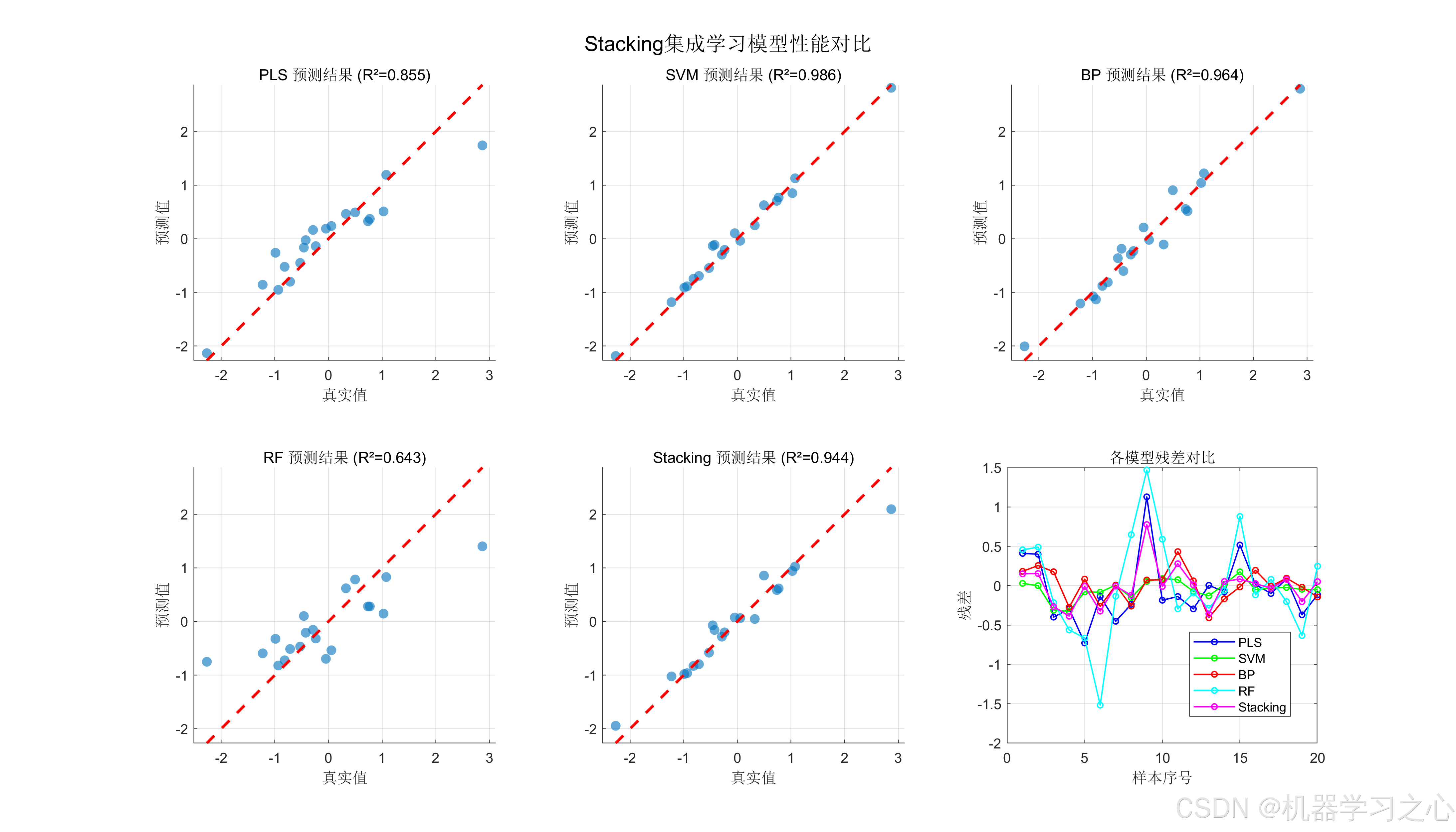 - 多模型集成回归预测:使用PLS、SVM、BP神经网络、随机森林作为基学习器,LSBoost作为元学习器。