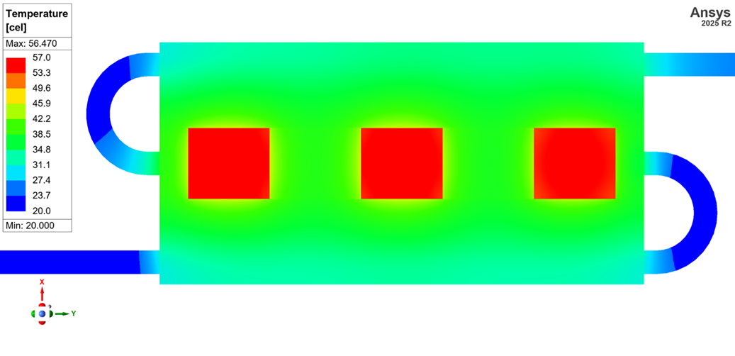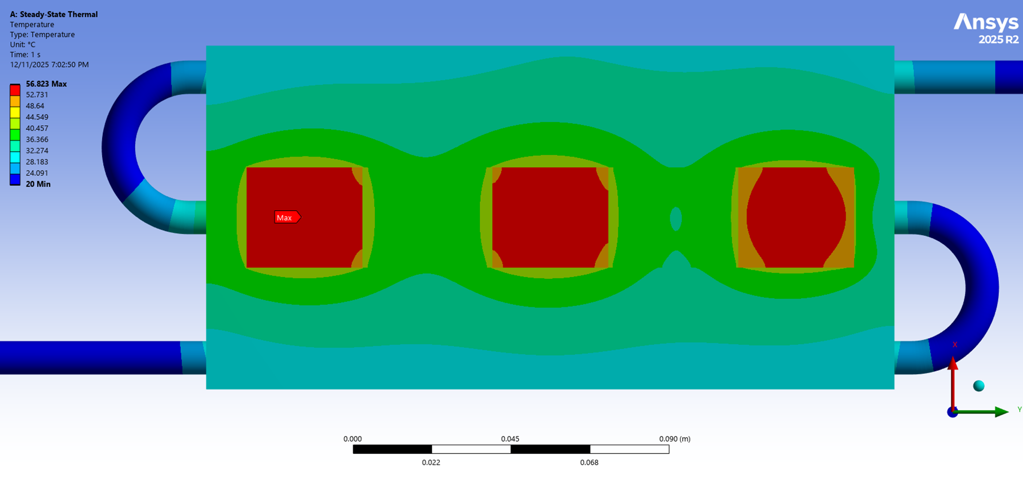 两次模拟计算的最高温度相似,Icepak 为 56.47 °C,Ansys Mechanical 为 56.82 °C,验证了我们问题的热结果。峰值值之外,整体热梯度和温度分布模式显示出强烈相关性,如下图热等高线对比所示。