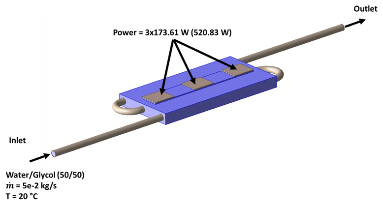 本次演示将使用一个简单的冷板几何形状,配备三个热源。该案例将在真空环境中解决,因此唯一存在的流体是流经冷板的流体。更详细的信息见下图。