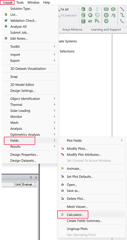 第一步是点击工具栏中的 Icepak,然后点击 Fields,最后是 Calculator,进入字段计算器。