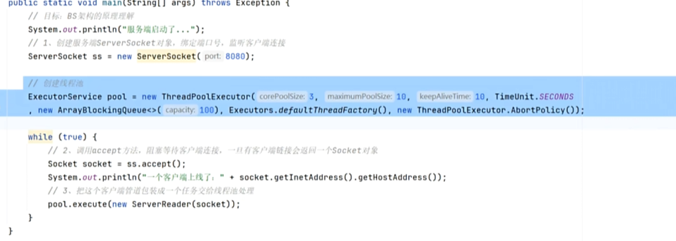 使用线程池优化:把所有客户端socket管道包装成任务对象让它们都成为任务,进入任务队列。线程池提供核心线程处理所有请求。