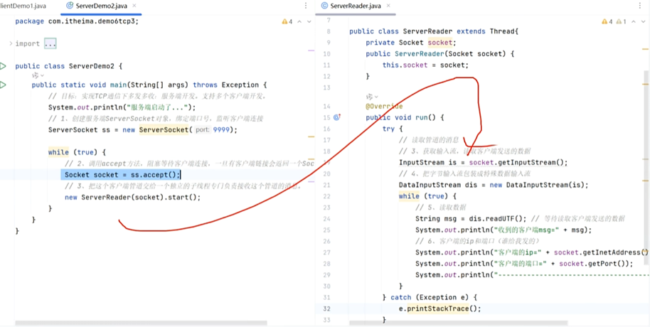 方案:主线程负责循环接收客户端管道的连接 ,每接收到一个Socket通信管道后,把该客户端管道交给独立的子线程专门负责接收这个客户端管道的消息。