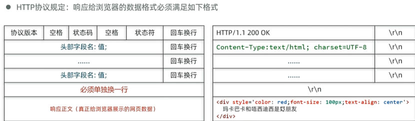 客户端使用浏览器发起请求 (不需要开发客户端)。服务器必须给浏览器响应HTTP协议规定的数据格式 ,否则浏览器不识别返回的数据.