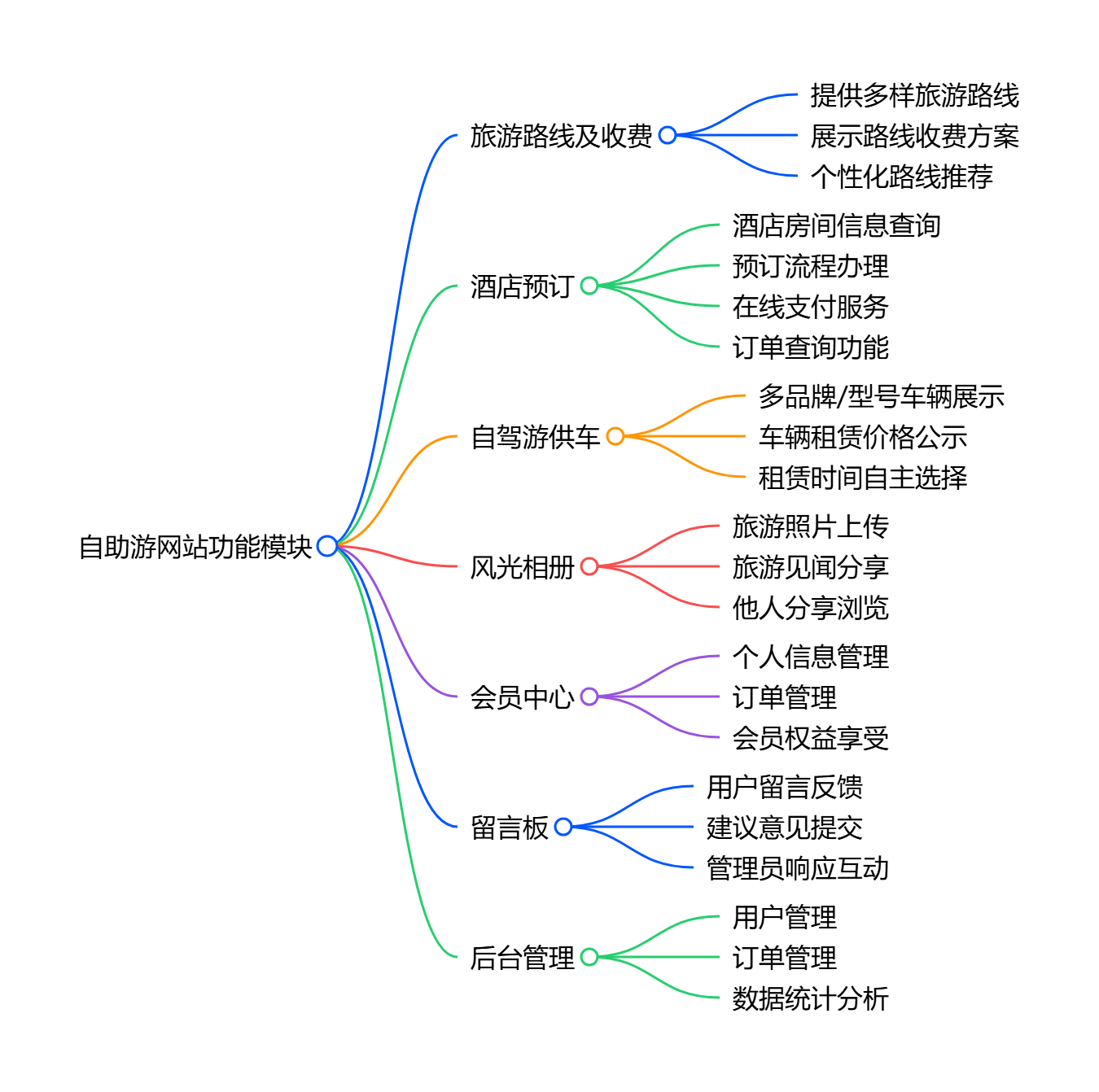 - 旅游服务核心:提供多样旅游路线及收费方案,支持个性化推荐;涵盖酒店预订(含在线支付、订单查询)、自驾游汽车租赁服务。