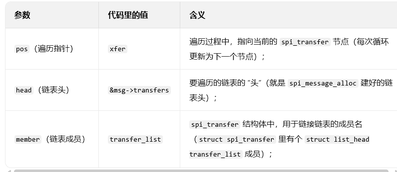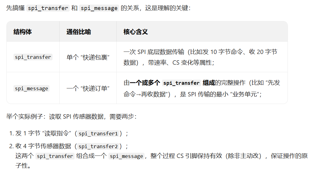 驱动的责任:只需要处理单个 spi_transfer 的硬件收发(比如往控制器寄存器写数据、读数据),完全不用关心 "这个包裹属于哪个订单""订单里有多少个包裹";