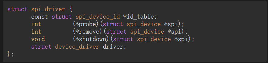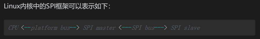 CPU是主设备,负责托管SPI控制器,也叫SPI主设备。SPI主设备管理托管了SPI从设备的总线,总线由平台驱动程序管理,从设备由SPI设备驱动程序驱动。