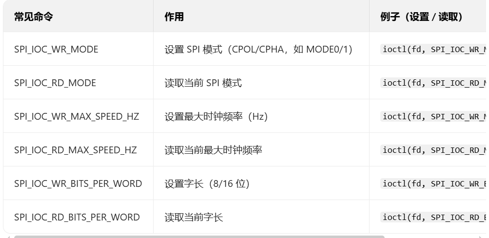 为了做到全双工,你别无选择,只能使用ioctl()系统调用。在这里,你可以根据需要传递输入和输出缓冲区。此外,通过 ioctl()系统调用,你可以使用一组SPI_IOC_RD_*和SPI_IOC_WR_*命令来获取RD并设置WR以覆盖设备当前的设置。完整的列表和文档可以在内核源代码的Documentation/spi/spidev目录中找到。