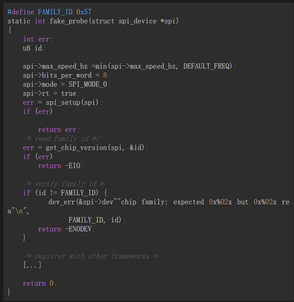 ioctl()系统调用允许在不停用CS的情况下执行复合操作,并使用SPI_IOC_MESSAGE(N)请求。这将产生一个新的数据结构,即struct spi_ioc_transfer,它是用户空间中与struct spi_transfer等价的数据结构。使用ioctl命令的例子如下: