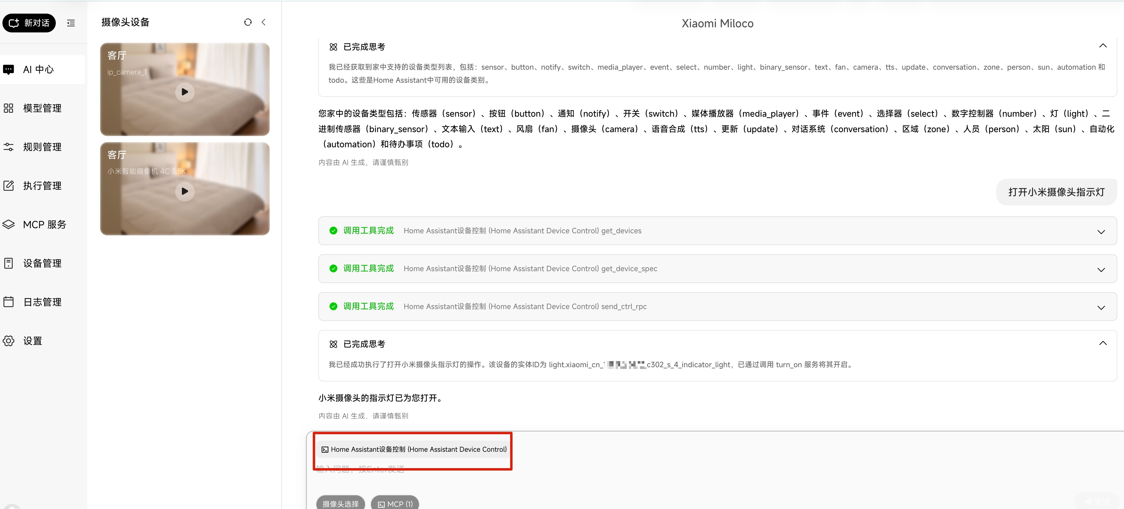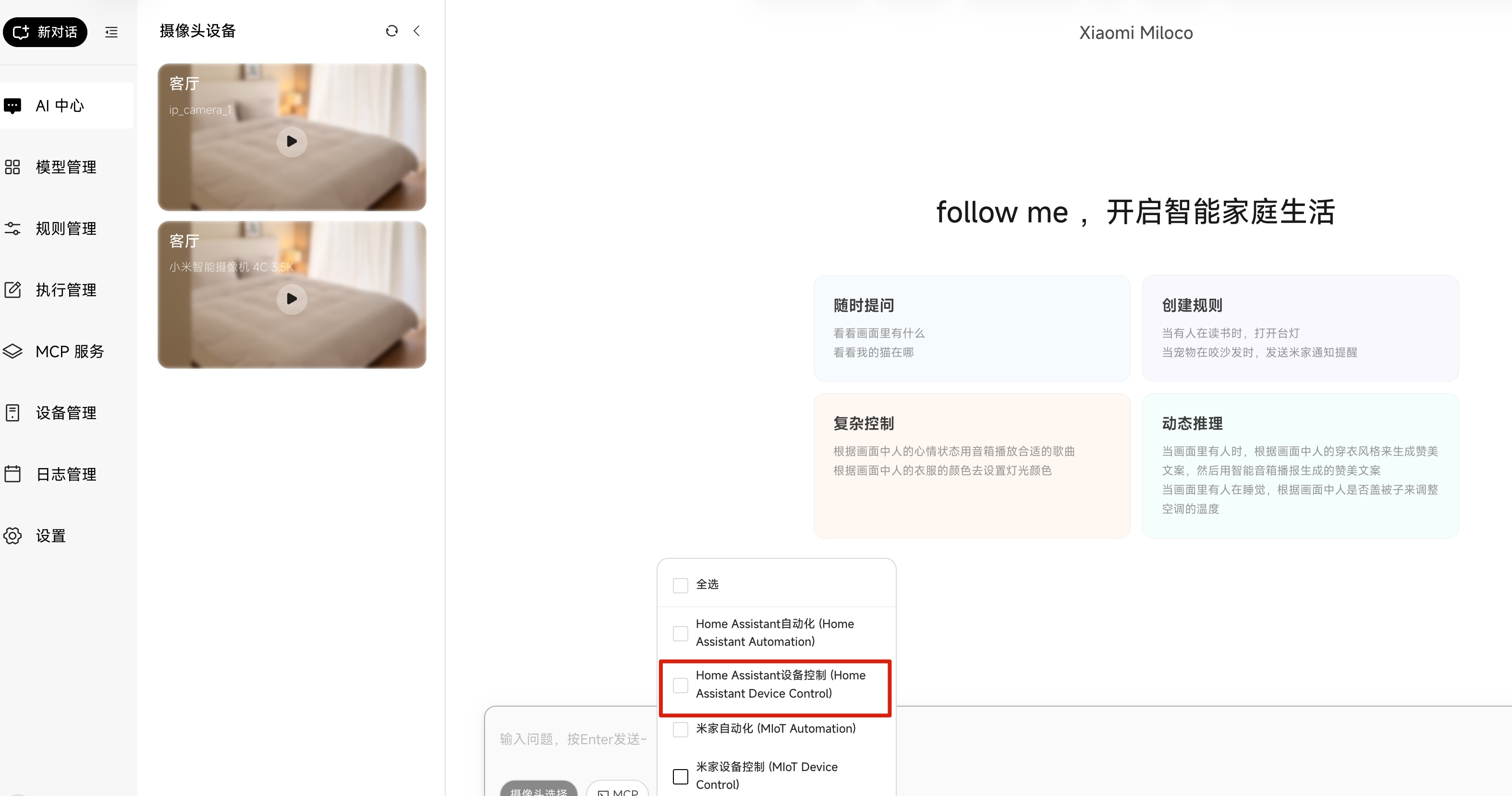 为了让 AI 逻辑与硬件控制解耦,Miloco 深度集成了 MCP (Model Context Protocol)。在对话开始前,你可以灵活选择开启哪些控制能力。