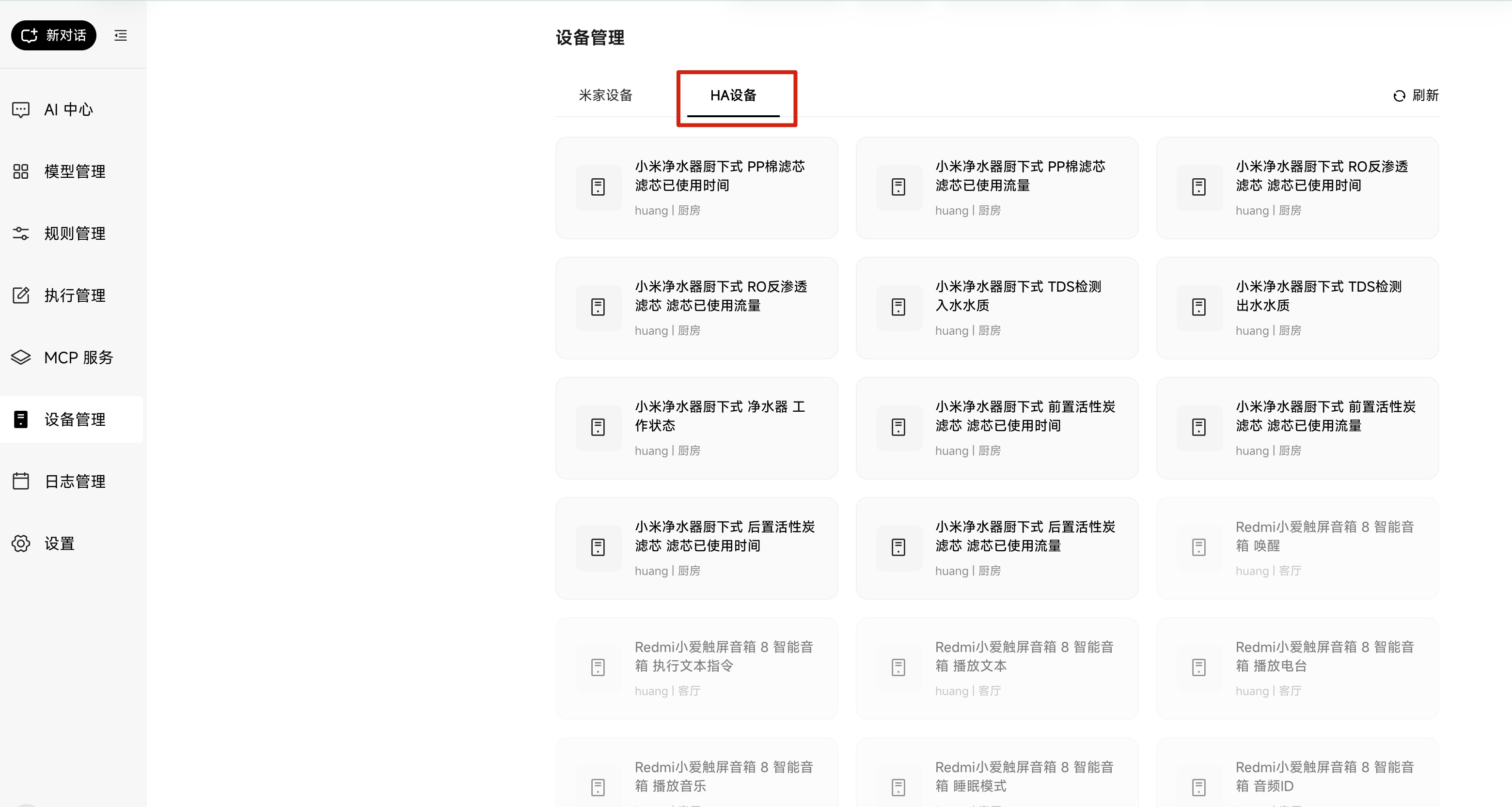 在新的"设备管理"界面中,我们增加了专门的 HA 设备 选项卡。Miloco 会自动同步 HA 中的各类实体,包括传感器(sensor)、开关(switch)、灯光(light)以及多媒体播放器(media_player)等。