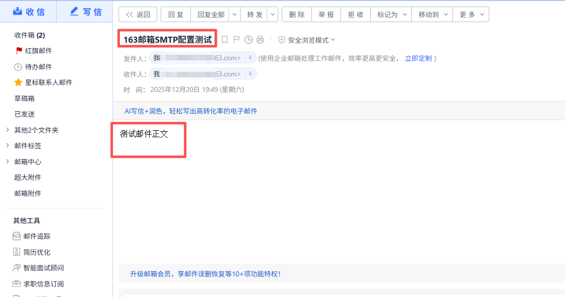 运行结果:✅ 163邮箱配置测试成功!请检查收件箱。