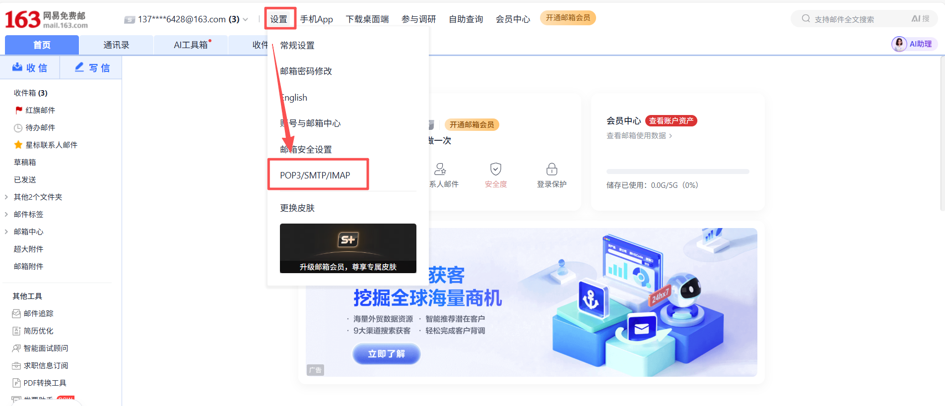 点击设置(齿轮图标⚙️)→ 找到"POP3/SMTP/IMAP"设置