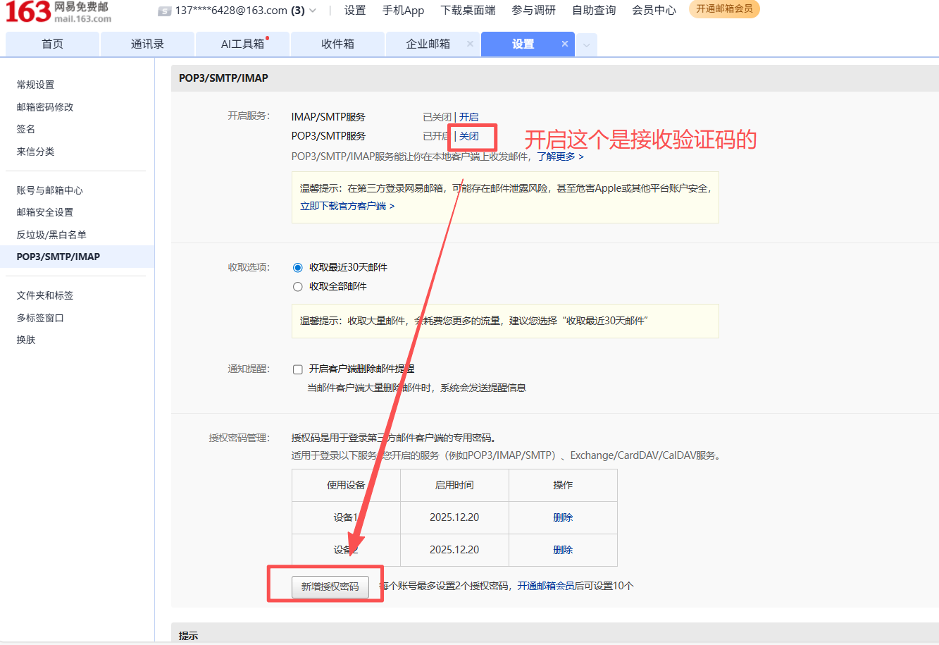 3、开启【POP/SMTP】服务,再点击【新增授权码】(只会出现一次,一定得保存好!!!)