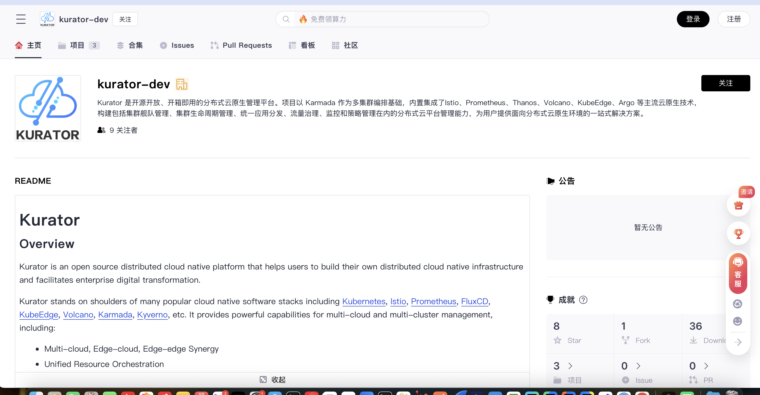 Kurator是业界首个分布式云原生开源套件,核心价值是将分散的云原生组件(Karmada、KubeEdge、Istio等)整合为开箱即用的统一平台,提供集群生命周期管理、跨集群应用分发、统一流量治理、全局监控等能力,彻底解决多云管理的配置碎片化、协同困难等痛点。