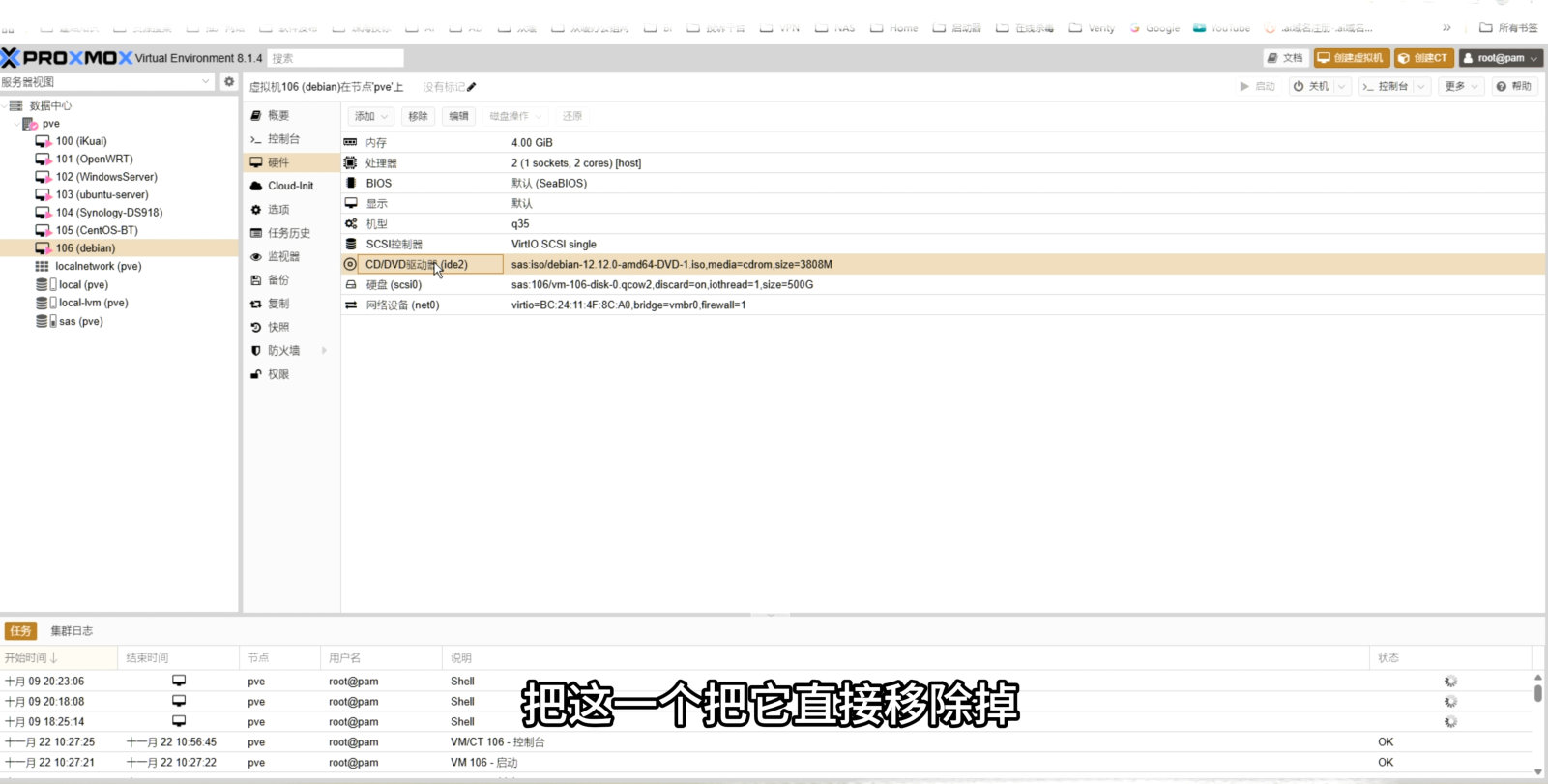 - 完成退出介质:硬件页移除CDROM。