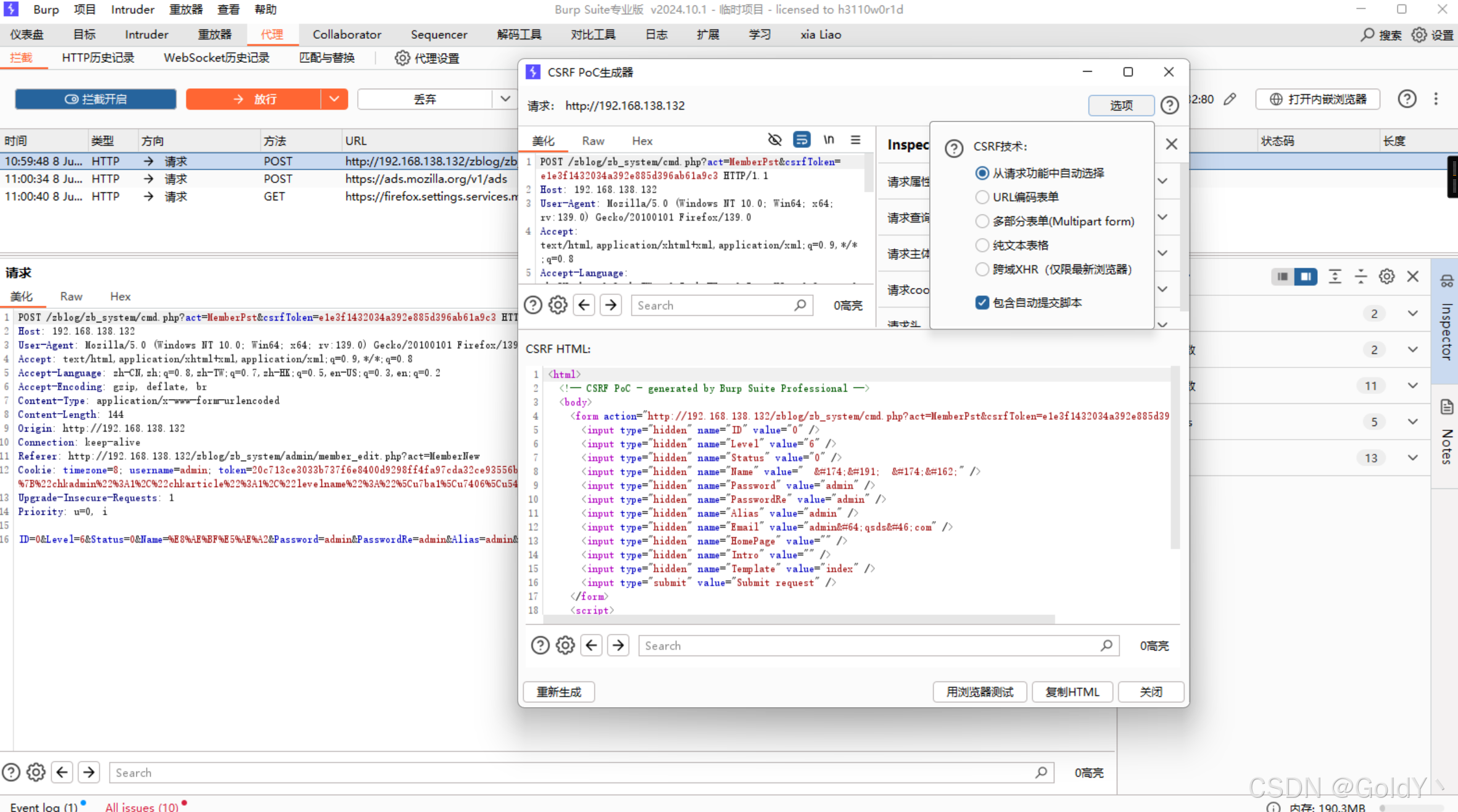 ```  #### XSS Filter 通过过滤机制,将\<、\> 、" 、' 、script等进行过滤,达到保护的效果。 使用htmlspecialchars()等函数对特殊字符进行编码 * 常见过滤绕过技术 * 实体化编码绕过 * 实体化现象: 尖括号被转换为HTML实体如\<变为\<,导致XSS语句失效 * 检测方法: 右键审查元素查看前端代码,确认输入内容是否被实体化处理 * 绕过思路: 寻找页面中未被实体化的输出点,可能存在于不同HTML属性中 * 引号闭合技术 * 双引号闭合: 当输出在双引号内时,使用"闭合前面引号,如`">` * 单引号闭合: 根据代码实际使用情况,可能需要使用单引号'进行闭合 * 实战技巧: 黑盒测试时需要同时尝试单双引号闭合,白盒测试可通过查看源码确定使用哪种引号 * 事件触发绕过 * 事件类型: 使用onfocus、onclick、onmouseover等HTML事件触发JS代码 * 应用场景: 当标签属性被过滤时,可在现有标签中添加事件属性如οnclick="alert(1)" * 优势: 不需要完整script标签,直接在合法标签中插入事件属性即可执行 * 高级绕过技术 * 大小写绕过 * 原理: 当过滤器仅匹配小写script时,使用ScRipt等大小写混合形式绕过 * 局限性: 仅对大小写敏感的简单过滤有效,若使用正则表达式如/script/i则无效 * 双写绕过 * 过滤机制: 当过滤器将script替换为空字符串时,使用scrscriptipt形式 * 执行原理: 过滤后中间的script被删除,前后部分拼接仍形成完整script标签 * Unicode编码绕过 * 应用场景: 主要用于URL中的XSS,将关键字符如script转换为Unicode编码 * 浏览器特性: 浏览器会自动解码URL中的Unicode字符,但页面内显示可能不识别 * 示例: javascript:alert(1)可编码为\\u006A\\u0061\\u0062\\u0061\\u0073\\u0063\\u0072\\u0069\\u0070\\u0074:alert(1) 实战注意事项 * 协议检测: 实际应用中常检测URL是否包含http://或https://,需在XSS中保留这些协议标识 * 隐藏属性利用: 检查表单中type=hidden的属性值,可能包含可控制的XSS注入点 * 多参数测试: 黑盒测试时应对所有参数进行测试,包括URL参数和表单隐藏参数 ### XSS黑盒测试 核心思路相同: 黑盒测试XSS与SQL注入的测试思路本质相同,都是寻找输入输出点 测试要点: * 关注页面中显示的数据是否来自用户可控的输入 * 检查GET/POST请求、HTTP头信息(如User-Agent、Cookie等)中的可控制参数 * 验证输入是否被直接输出到页面中执行 **关键判断依据: 主要看JS代码是否被成功执行,而非单纯看输入是否被输出** ### XSS工具推荐 XSStrike工具库 [https://github.com/s0md3v/XSStrike](https://github.com/s0md3v/XSStrike "https://github.com/s0md3v/XSStrike") 测试GET传参的网页: python3 xsstrike.py -u "[http://192.168.26.138/xss.php?payload=1](http://192.168.26.138/xss.php?payload=1 "http://192.168.26.138/xss.php?payload=1")" 测试POST数据: python3 xsstrike.py -u "[http://example.com/search.php](http://example.com/search.php "http://example.com/search.php")" --data "q=query" python3 xsstrike.py -u "[http://example.com/search.php](http://example.com/search.php "http://example.com/search.php")" --data '{"q":"query"} --json' ## CSRF跨站请求伪造 跨站请求伪造(Cross-Site Request Forgery)是一种Web攻击方式,攻击者利用用户已登录状态伪造请求。 攻击流程: * 用户登录受信任网站A(如银行网站)并保持会话 * 用户访问恶意网站B,该网站包含伪造请求代码 * 恶意网站B自动向网站A发起请求(如转账请求) * 网站A误认为这是用户的合法操作 攻击条件: * 伪造数据包:需要获取或构造目标请求的完整数据包(如支付接口参数) * 防护绕过:目标网站无CSRF防护或防护可被绕过(如仅依赖Cookie验证) * 用户触发 * 已登录目标网站 * 访问恶意构造的页面 防护措施: * Referer校验:验证请求来源 * Token机制:添加动态令牌验证 * 验证码:关键操作需二次确认 示例: 1、伪造增加用户数据包 安装zblog,登录到后台用户管理界面  使用burp抓取数据包 右键---\>相关工具---\>生成csrf poc  复制到html后,访问发现无法创建用户  存在一定的安全策略:refer头检验和csrf token检验 ### 安全机制绕过 #### **refer头绕过** * 严谨检测:**完全验证请求来源,无安全缺陷** * 不严谨检测:存在验证逻辑漏洞,可能被绕过 * 如检查是否含有站点地址,而不是检测只有站点地址 绕过方式: referer置空 修改referer:在web服务器通过搭建和站点相同的名称,来绕过不严谨的检测方式(理论) 不严谨检测示例: ``` "; } echo $img; ?>* ``` 该函数从用户指定的URL获取内容,并将其保存到本地文件中[1](https://blog.csdn.net/qq_43378996/article/details/124050308 "1")。 2. **fsockopen()**: ``` ``` · 该函数使用socket与服务器建立TCP连接,传输原始数据[1](https://blog.csdn.net/qq_43378996/article/details/124050308 "1")。 3. **curl_exec()**: ``` ``` 该函数通过cURL获取数据,并将其保存到本地文件中[2](https://www.freebuf.com/articles/web/333318.html "2")。 ### SSRF漏洞挖掘 **黑盒探针:** 业务功能点 1.社交分享功能:获取超链接的标题等内容进行显示 2.转码服务:通过URL地址把原地址的网页内容调优使其适合手机屏幕浏览 3.在线翻译:给网址翻译对应网页的内容 4.图片加载/下载:例如富文本编辑器中的点击下载图片到本地;通过URL地址加载或下载图片 5.图片/文章收藏功能:主要其会取URL地址中title以及文本的内容作为显示以求一个好的用具体验 6.云服务厂商:它会远程执行一些命令来判断网站是否存活等,所以如果可以捕获相应的信息,就可以进行ssrf测试 7.网站采集,网站抓取的地方:一些网站会针对你输入的url进行一些信息采集工作 8.数据