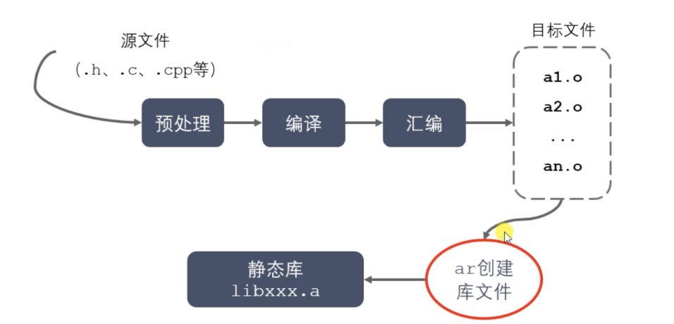.a(Linux)或.lib(Windows)为后缀。编译时将库代码复制到最终可执行文件中,导致文件体积增大。更新库需重新编译整个程序。静态库的生成示例(Linux):