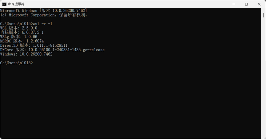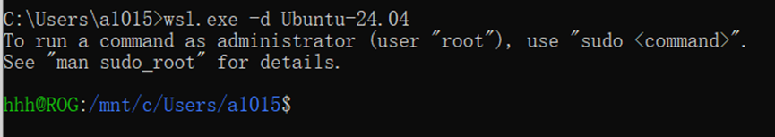 - 在命令行内输入wsl.exe -d Ubuntu-24.04,进入指定系统,如图: