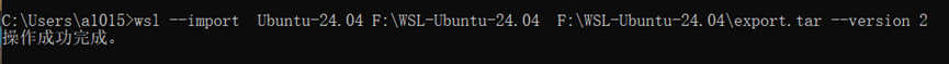 - 在命令行中输入wsl --import Ubuntu-24.04 F:\WSL-Ubuntu-24.04 F:\WSL-Ubuntu-24.04\export.tar --version 2并回车。如图