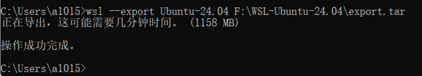 - 在命令行中输入wsl --export Ubuntu-24.04 F:\WSL-Ubuntu-24.04\export.tar并回车。如图