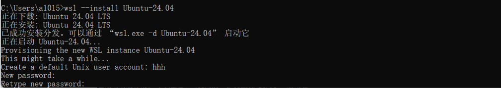 输入wsl --install Ubuntu-24.04并回车,显示如下: