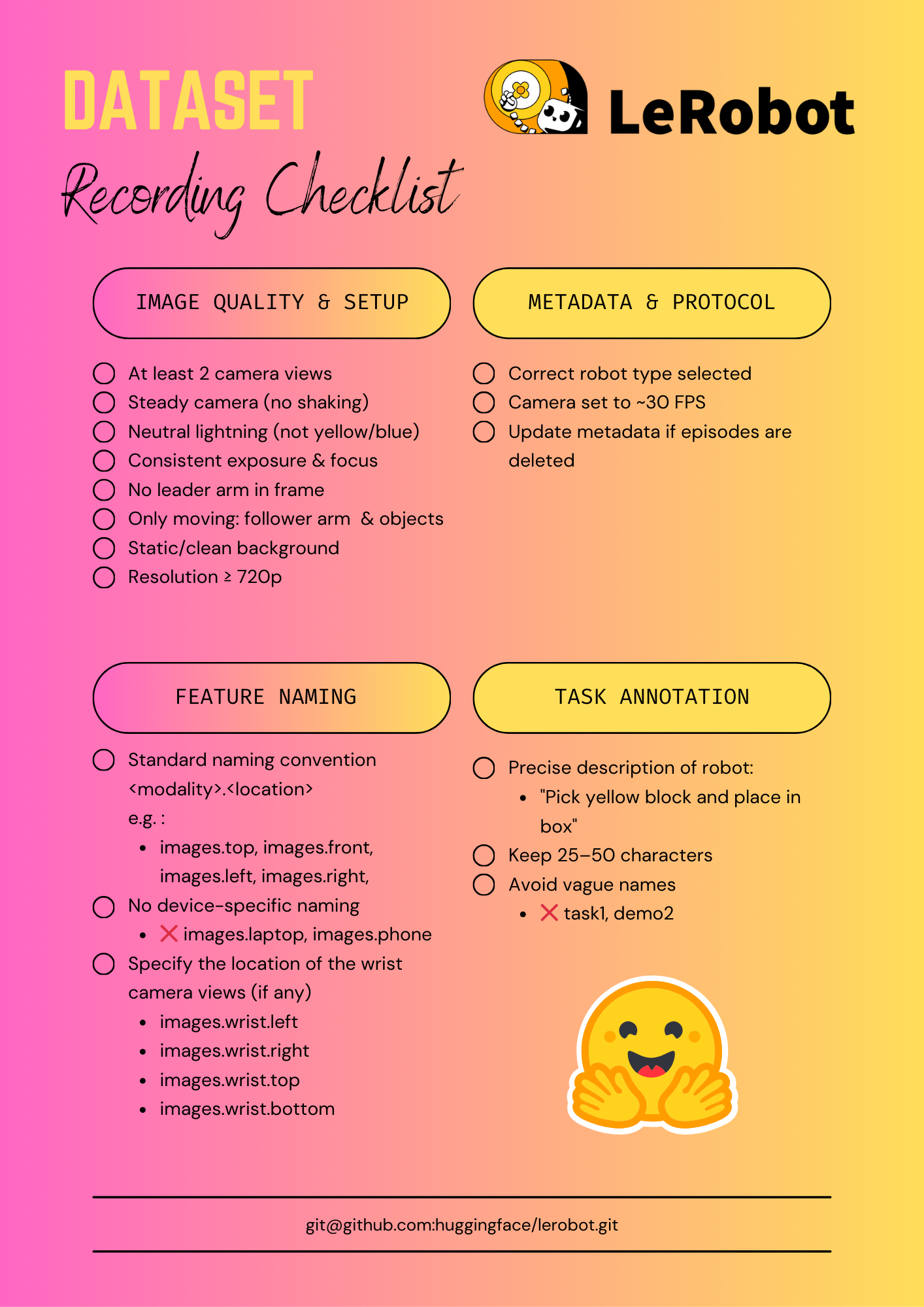 为了解决上述问题,我们建议在数据采集过程中严格遵守以下 LeRobot 录制规范: