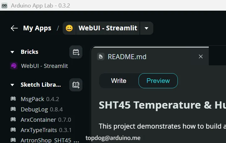 本示例是展示了如何将Arduino硬件与Python Web UI无缝集成,基于Arduino App Bricks框架构建一个实时温湿度监控系统。SHT45传感器每秒检测环境温湿度,通过Bridge通信层将数据传输到Python应用,最终在美观的Streamlit Web界面中实时展示。Arduino App Lab中的Streamlit金砖基于Python Web框架Streamlit的强大封装。她解决了传统Web开发的三大痛点: