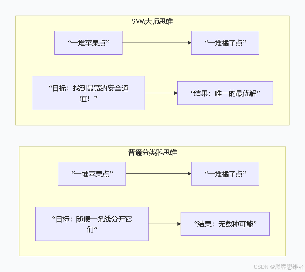 - 支持向量机:基于严格的数学和几何原理,像一个追求极致完美的"建筑师",目标是在数据空间中构建一个最优的"隔离结构"(比如一堵墙、一个平面)。