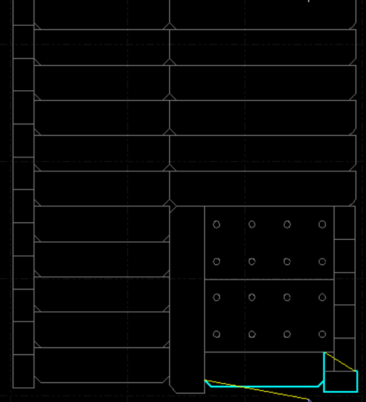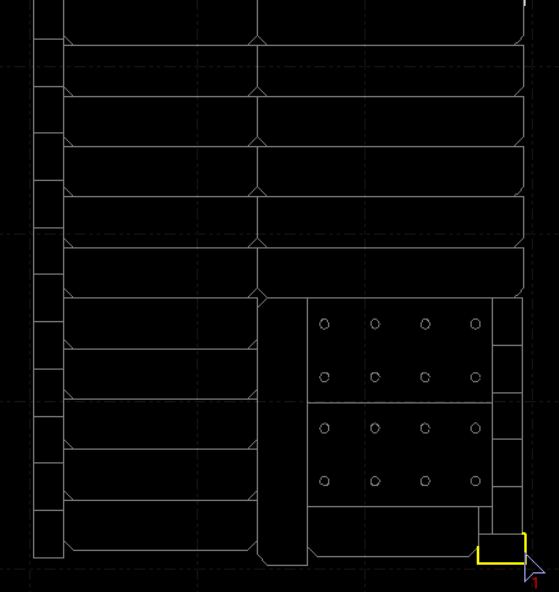 从图中可以看出,这是一个矩形区域的加工路径,且右侧有多个孔位和一个突出的小矩形区域(右下角黄色框标出)。由于刀路遵循"从短边S形从下到上"的规则,说明刀路应沿着较短边方向来回走,逐层向上推进。