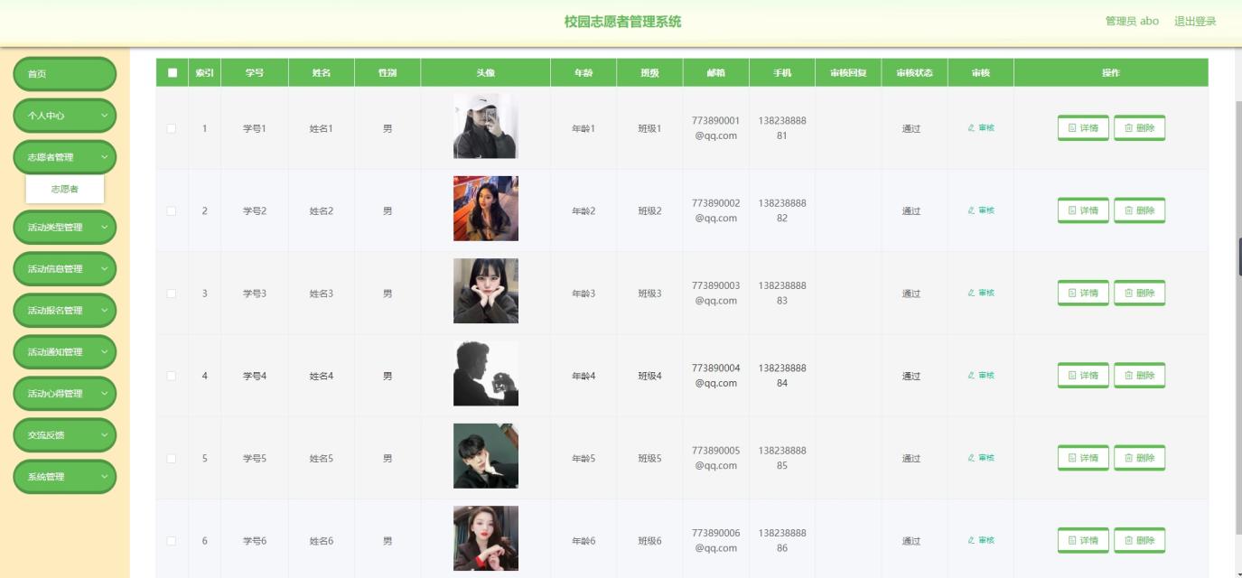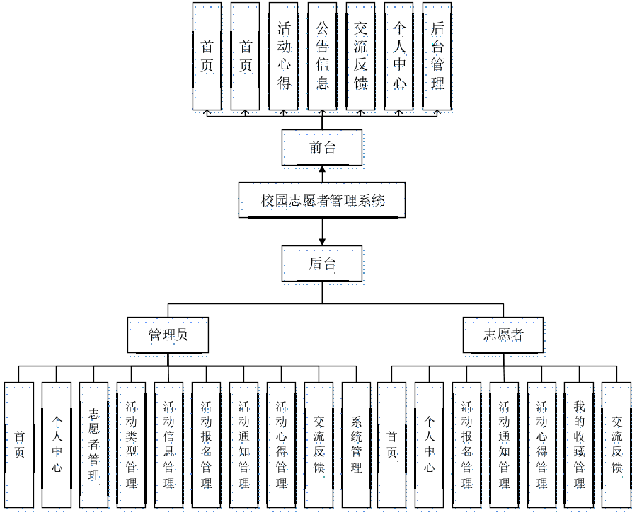 后台由管理员和志愿者,主要功能包括首页、个人中心、志愿者管理、活动类型管理、活动信息管理、活动报名管理、活动通知管理、活动心得管理、交流反馈、系统管理等功能。