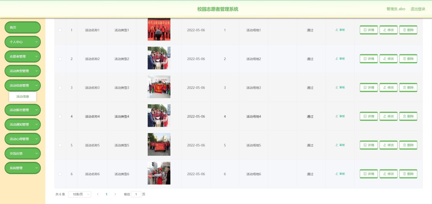 前台功能:用户进入系统可以实现首页、活动信息、活动心得、公告信息、交流反馈、个人中心、后台管理等功能进行操作;