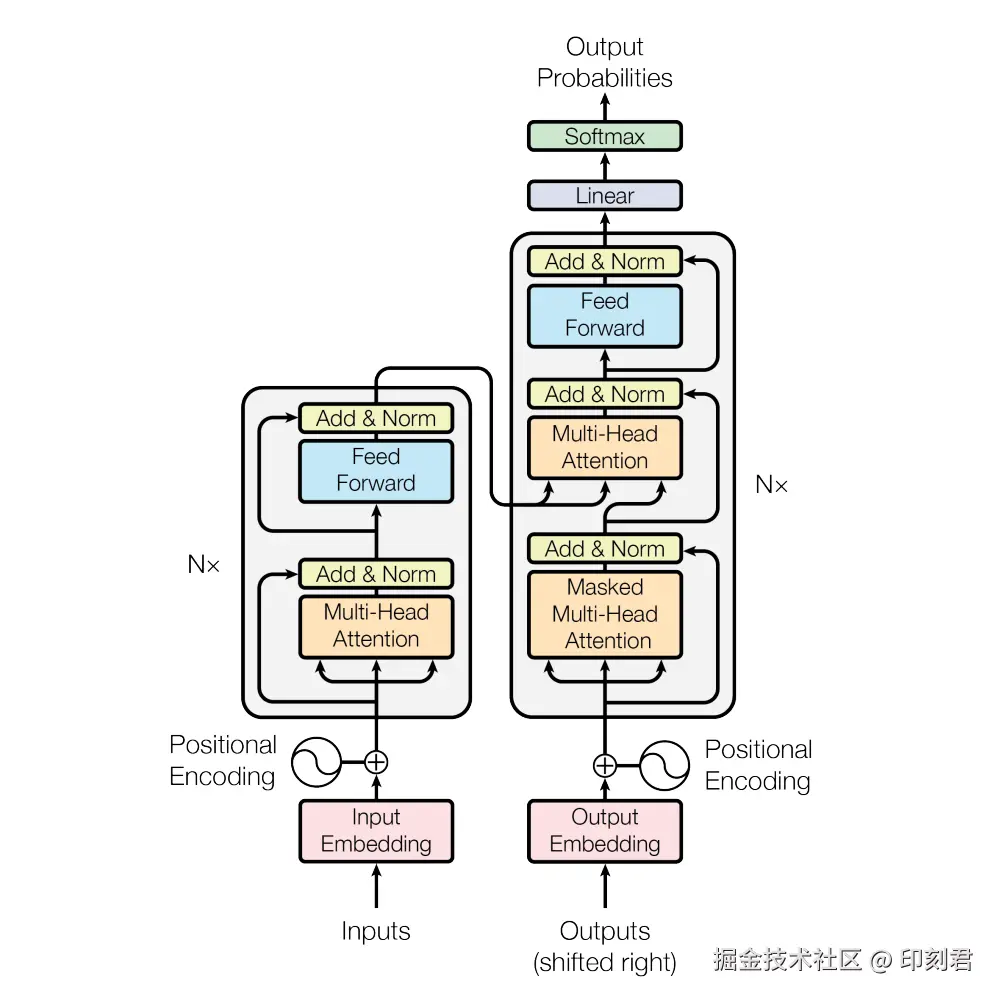 Transformer 架构的核心示意图如下, 整个结构分为左右两部分: 左侧是编码器 (Encoder), 右侧是解码器 (Decoder).