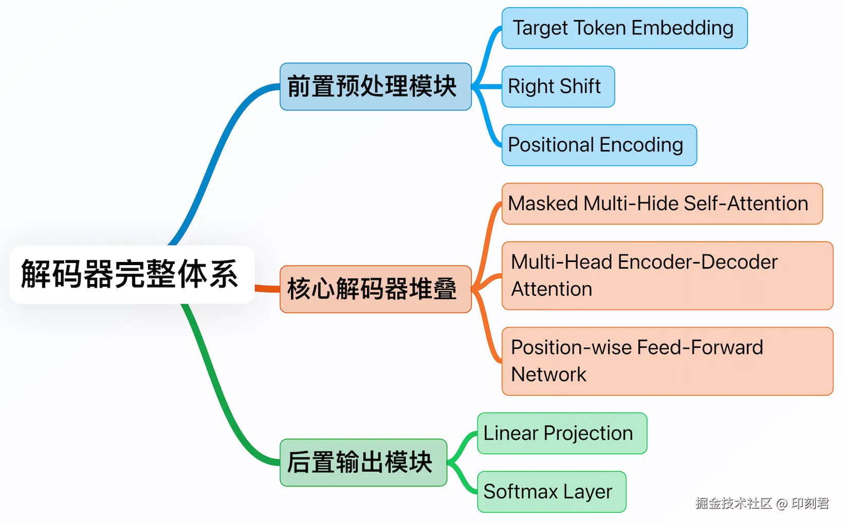 - 核心解码器堆叠: 流水线的核心加工环节, 通过 "注意力机制" 梳理词与词的关联, 把 "原料" 加工成包含完整语义逻辑的"半成品";