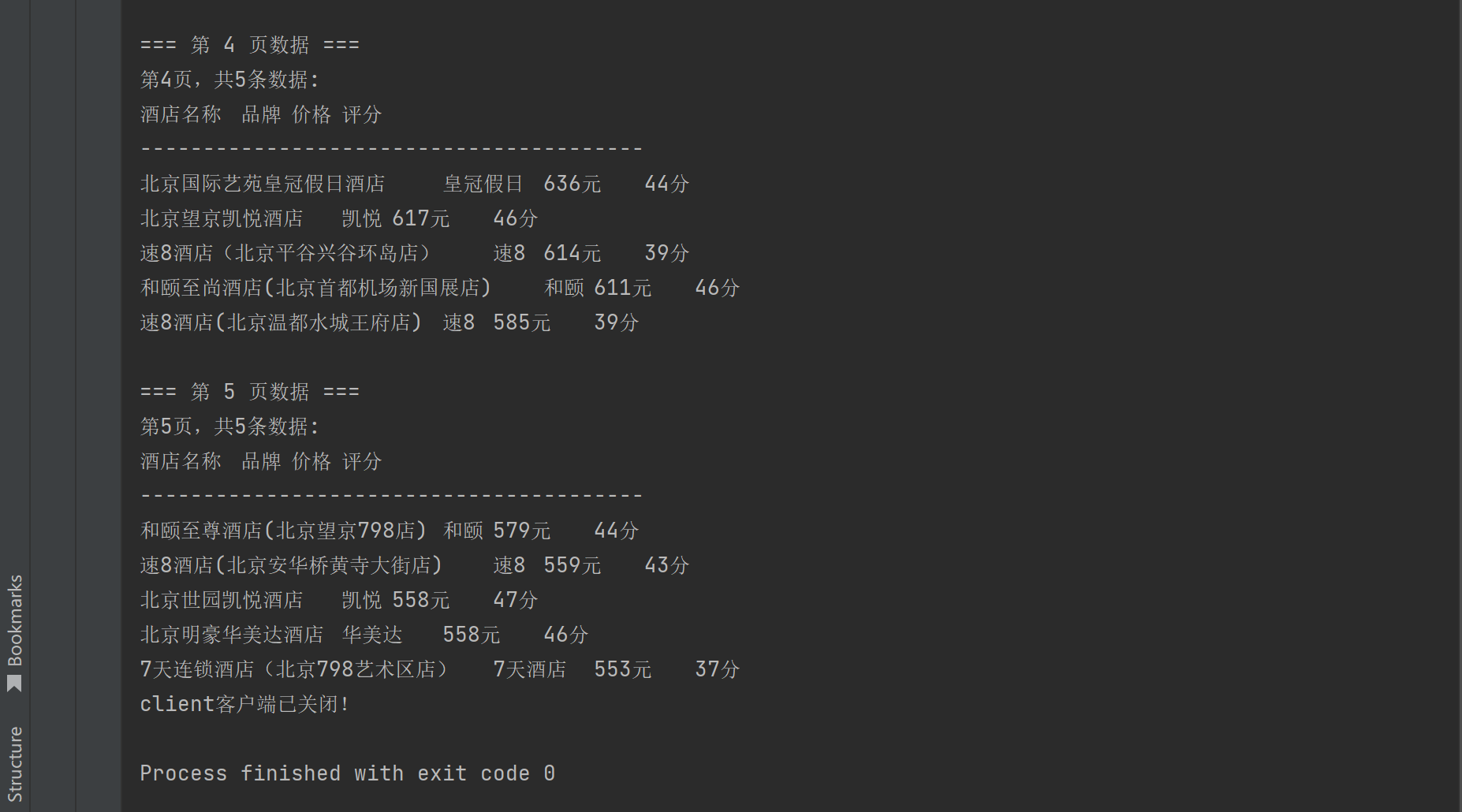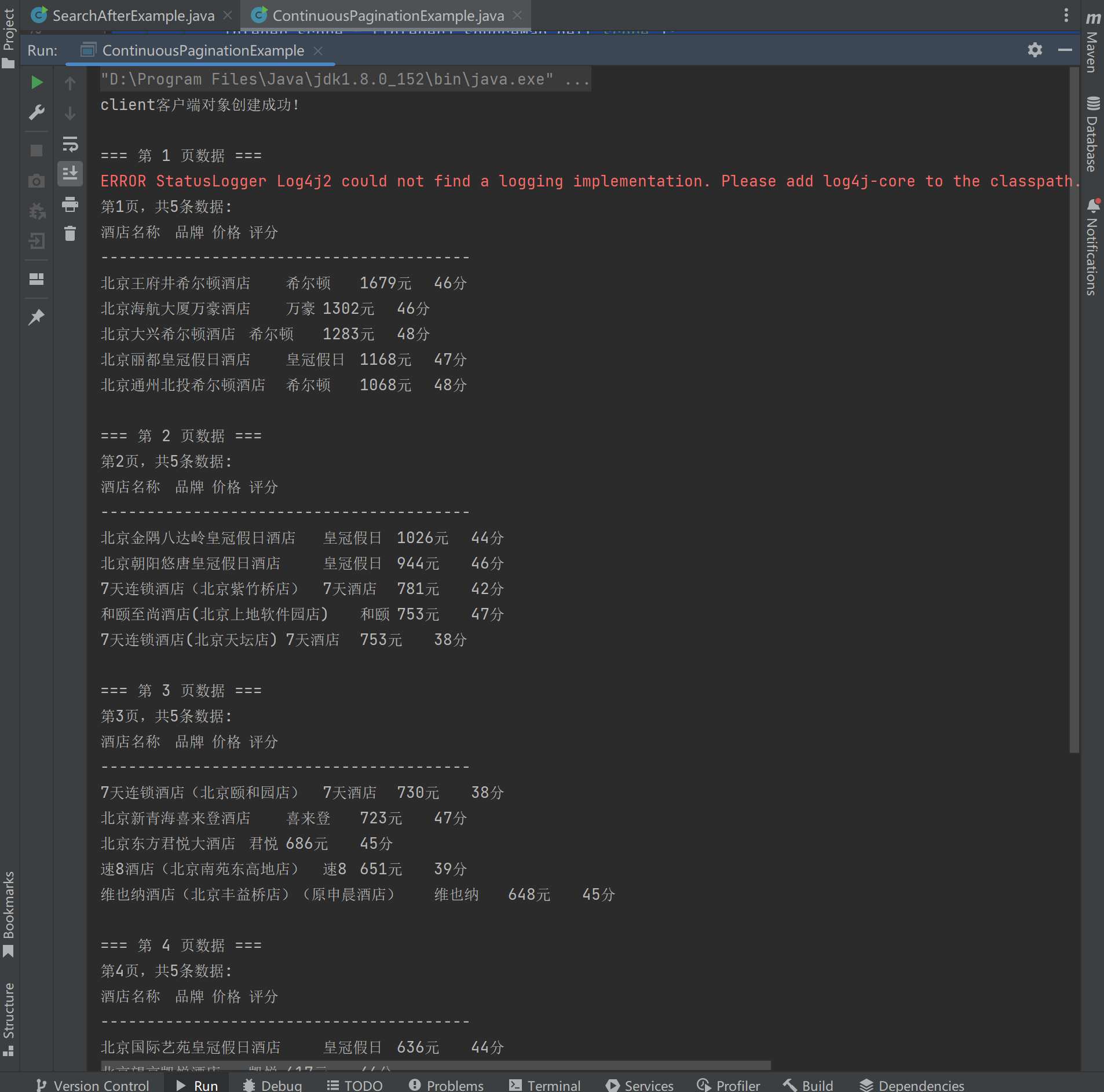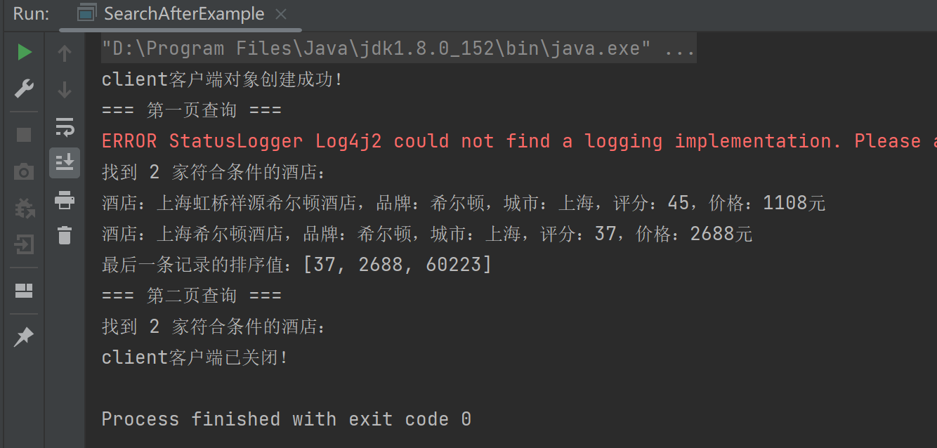 可以看到,第一页寻找完毕后,紧接着不再像之前那样通过sourceBuilder的from去指定来源页数,而是使用searchAfter取上一页最后一条记录值的排序值,来决定下一页size大小的内容。(不过这个查询条件就找到2家符合条件的酒店,所以第二次搜索的时候,去第二页就没数据了)。