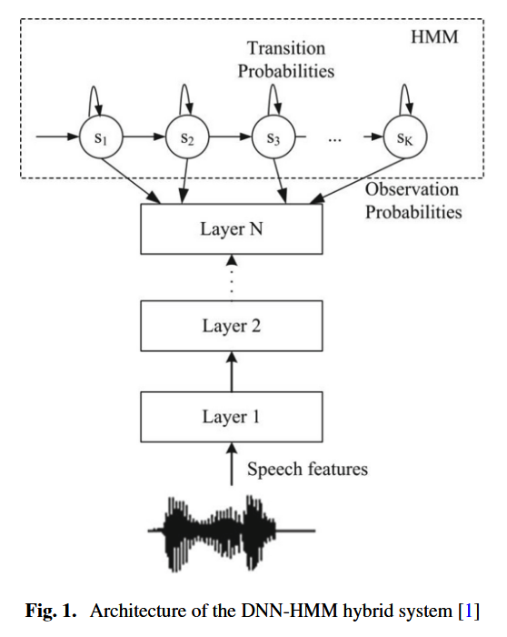 图 1 展示了DNN-HMM 混合系统的通用架构。该深度神经网络(DNN)经训练后,能够根据给定的声学观测数据,预测每个上下文相关状态的后验概率。在解码阶段,将神经网络输出的概率除以各状态的先验概率,得到一种 "伪似然值",并以此替代隐马尔可夫模型(HMM)中原有的状态发射概率 。
