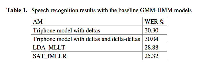 GMM-HMM 的实验结果汇总在表 1 中,表格包含核心指标 WER、不同模型变体(如单音子 / 三音子 / LDA+MLLT 版本)的对比数据