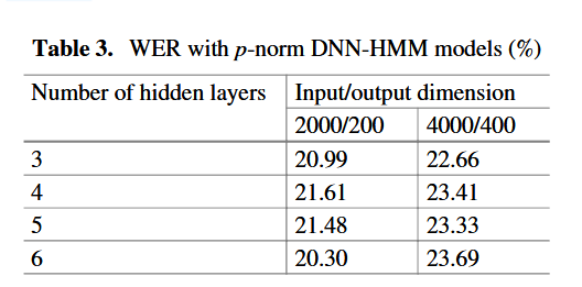 最优结构:6 层隐藏层 + 2000/200 输入 / 输出维度的 p-norm DNN 模型,WER 低至 20.30%,是该实验中性能最优的 p-norm 配置。