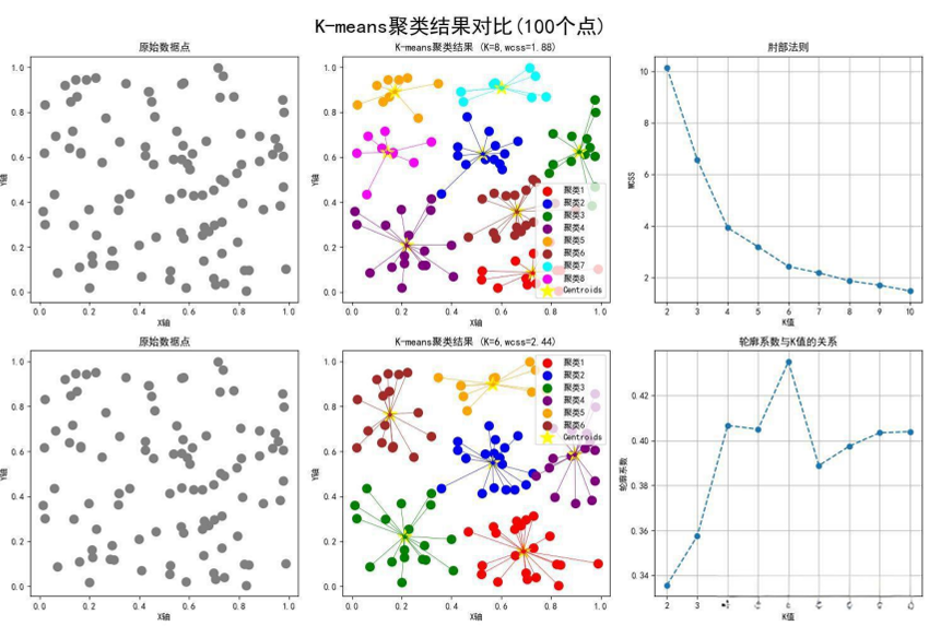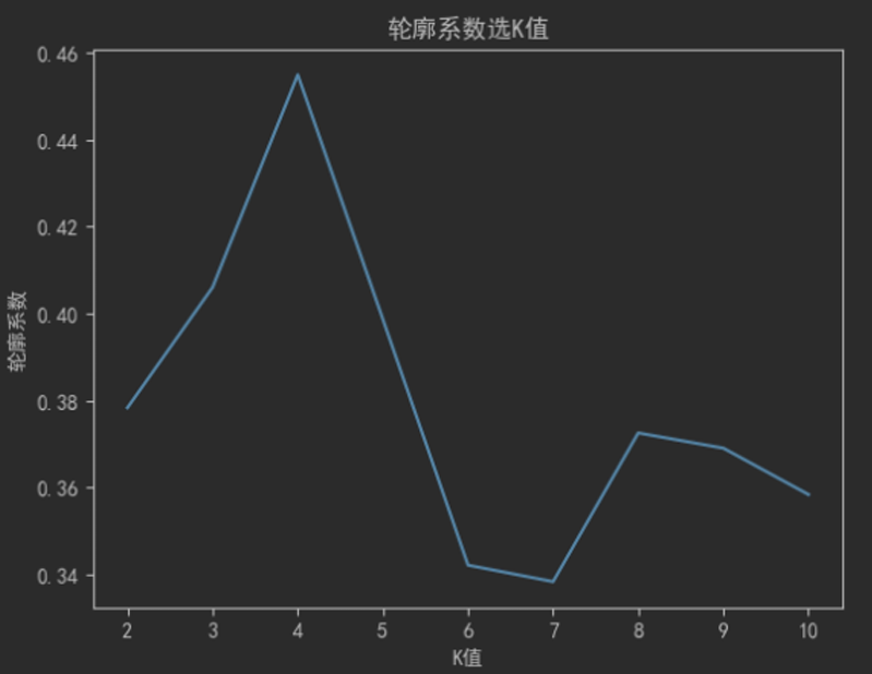 通过计算轮廓系数来评估不同K值的聚类效果,轮廓系数介于-1和1之间,值越大表示聚类效果越好。
