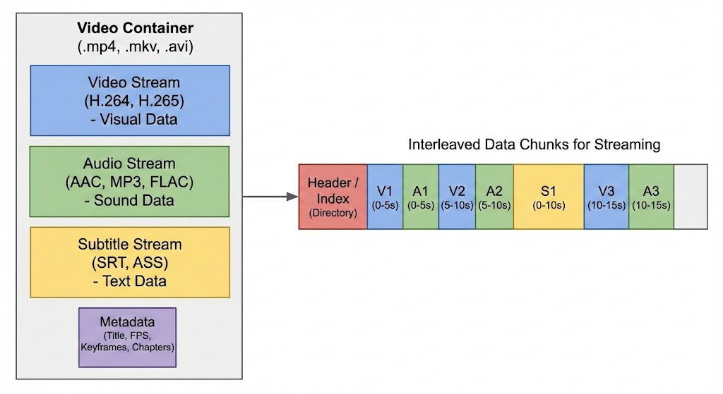 - 容器格式 (Container Format): 就像一个文件夹,用于将视频、音频、字幕等不同类型的数据流打包在一起。常见的容器格式有 MP4, MKV, AVI, MOV 等。