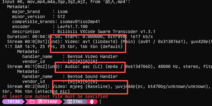 使用FFmpeg查看示例视频的信息:可以看到只有有视频和音频流。