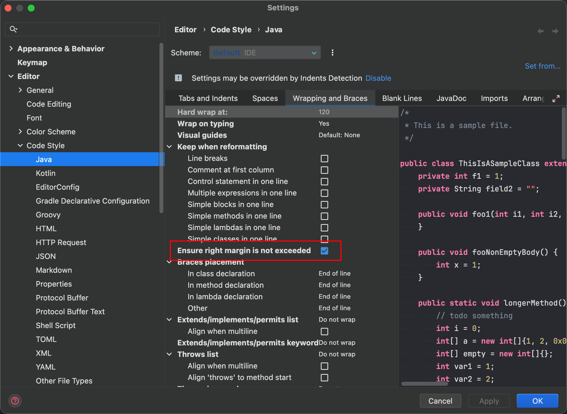 File->Setting->Editor->Code Style->Java->Wrapping and Braces
